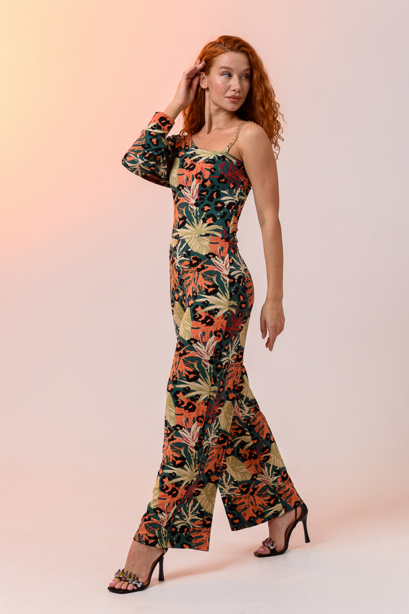 Стильный женский комбинезон с брюками палаццо открытым плечом на изящной цепочке и легким рукавом с разрезом. Выполнен из качественного материала хорошей растяжимости, не сковывает движения.