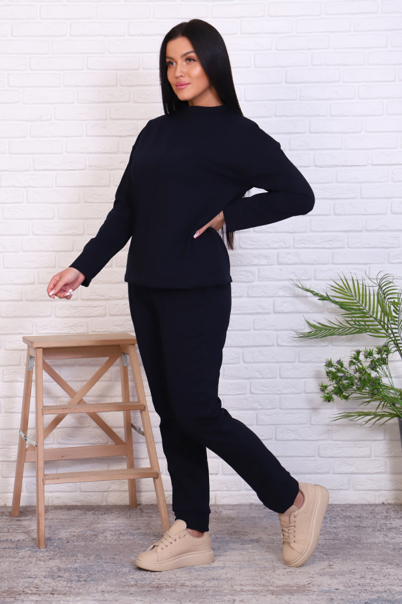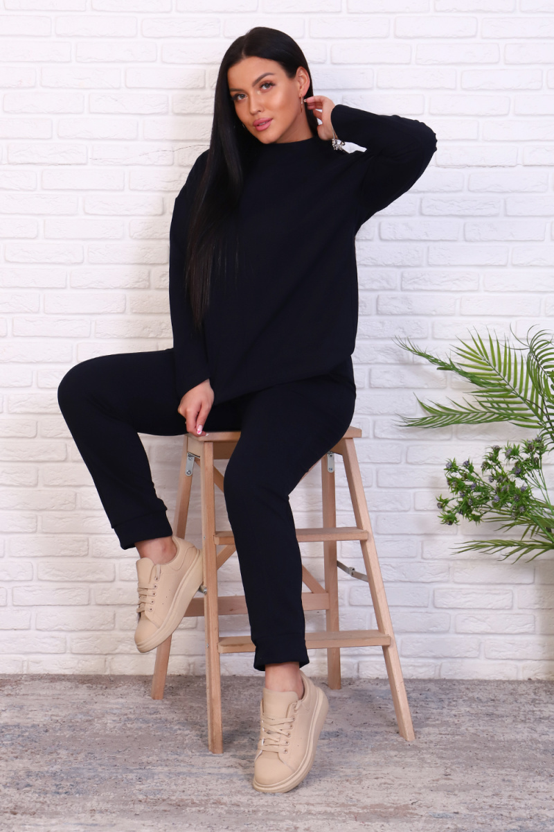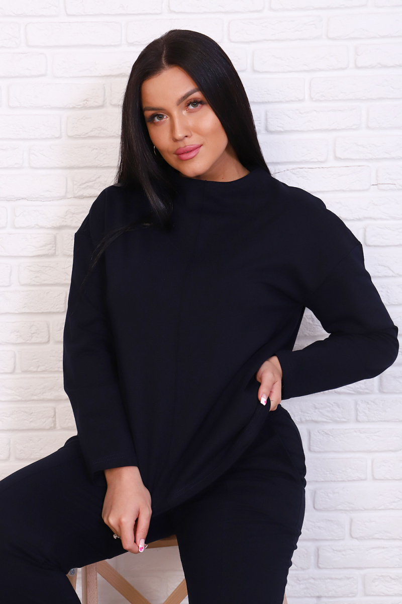 Стильный базовый костюм из хлопкового трикотажа отличного качества. Брюки прямого кроя, зауженные к низу, высокая посадка с простроченными стрелками, низ без резинки(не режет ногу), карманы в швах. Трикотажный джемпер длиной до середины бедра. По центру переда декоративный вертикальный защип вытягивает и стройнит. Горловина джемпера с цельнокроеной стойкой, обработана притачной обтачкой. Рукава джемпера длинный двухшовный, рубашечного кроя, линия плеча спущена. Полные размеры