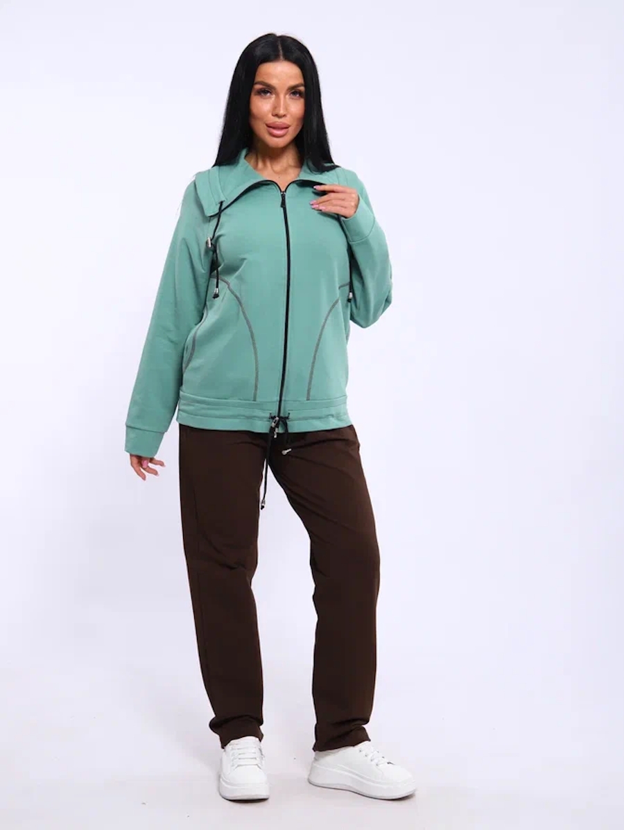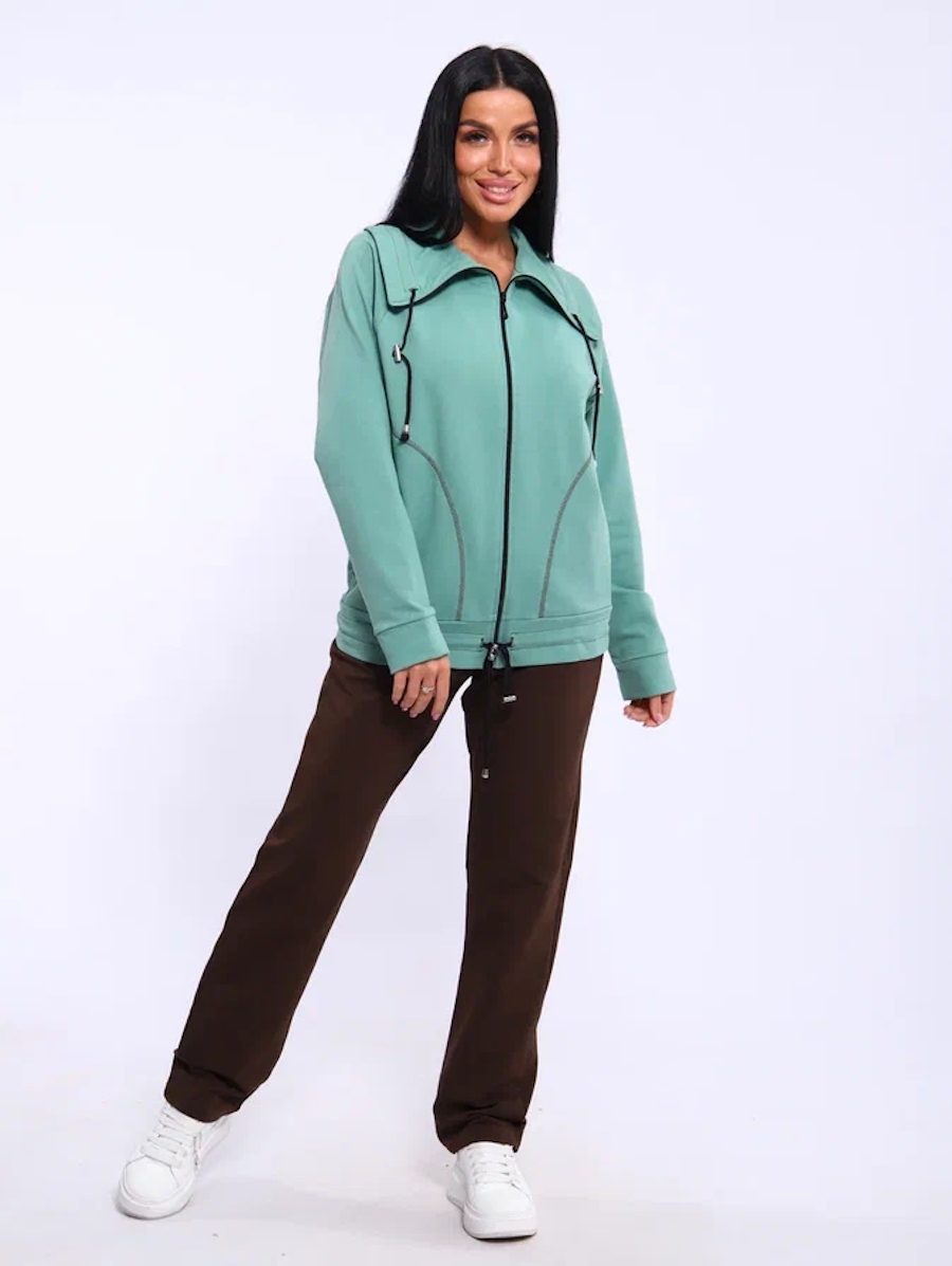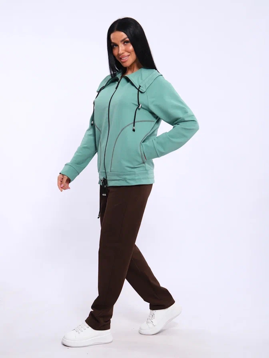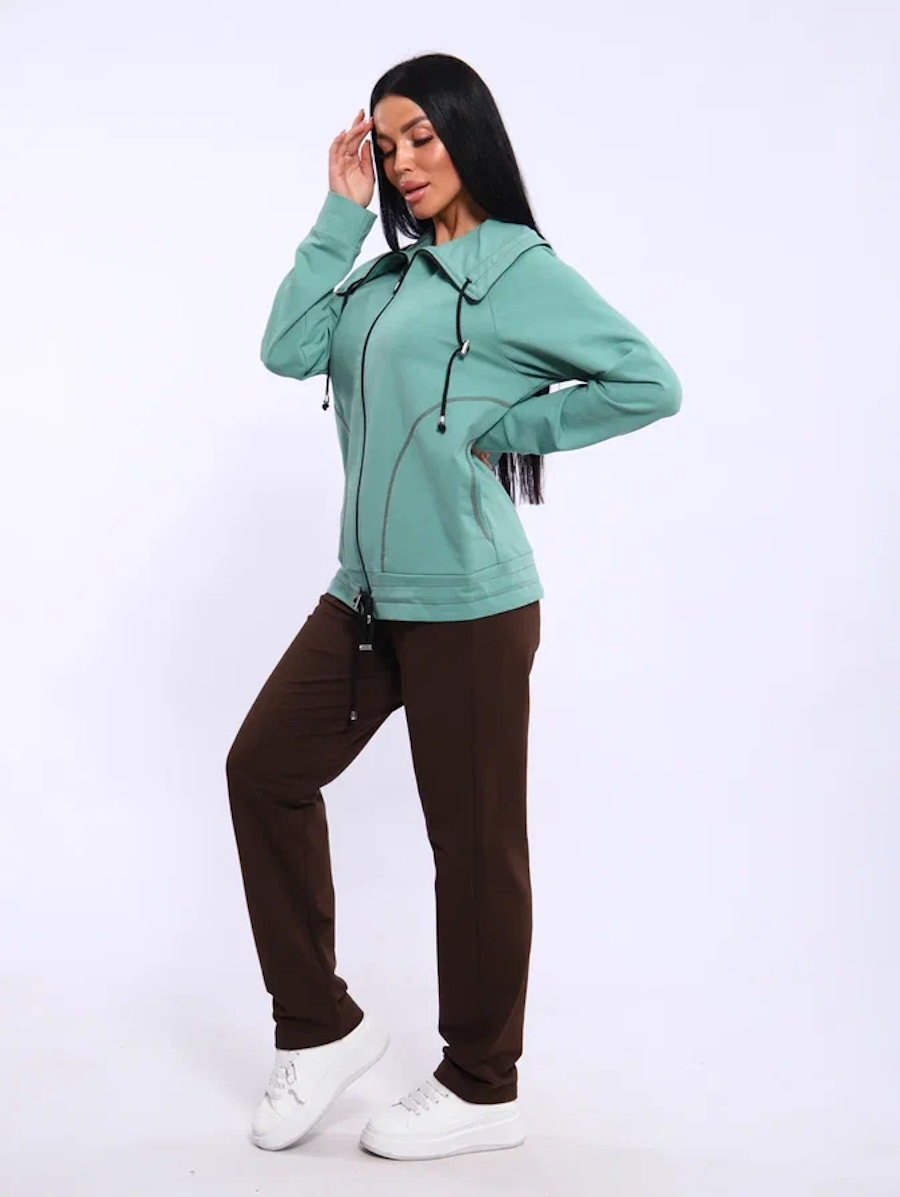 Спортивный женский костюм из эластичного футера. Брюки классического кроя без карманов на притачном поясе. Декоративный элемент в виде фиксаторов по дизайну не подбирается, может отличаться от представленного на фото.