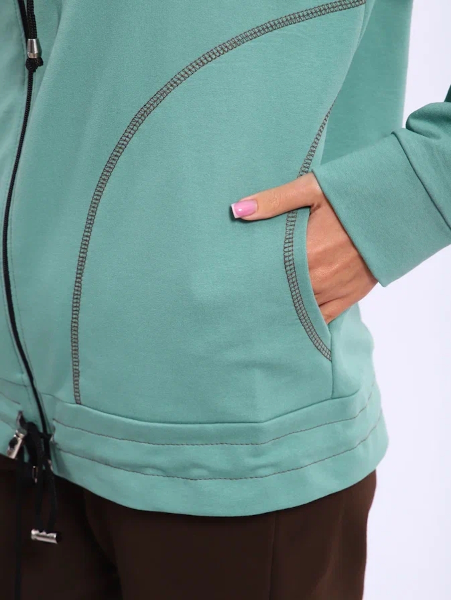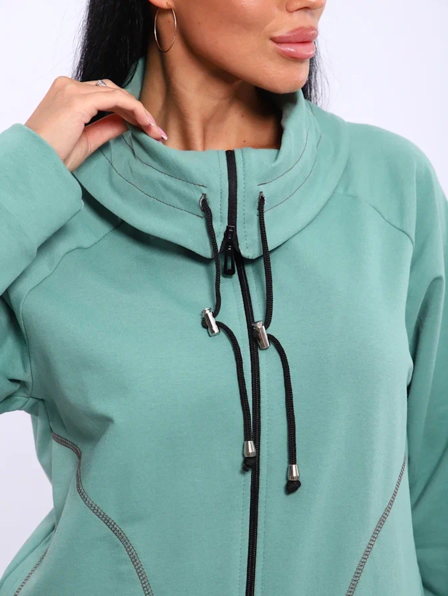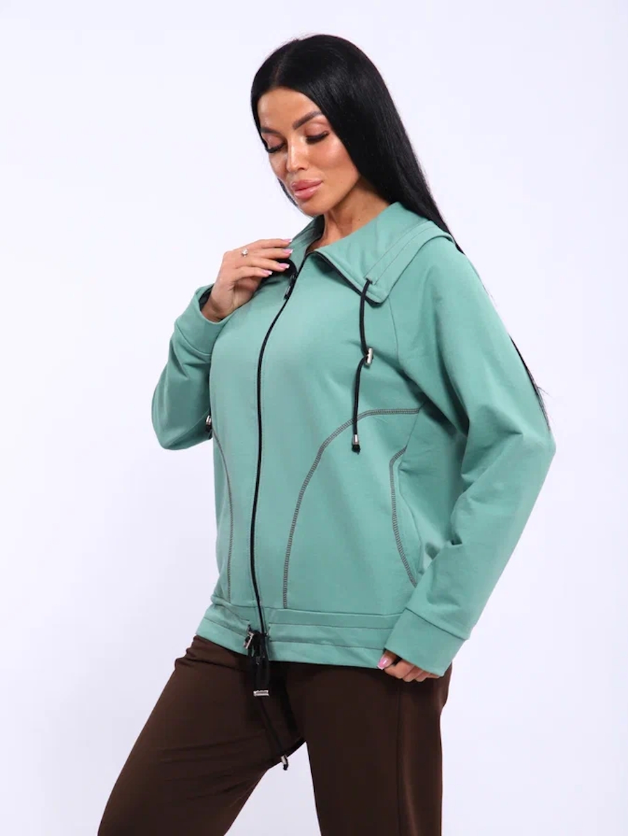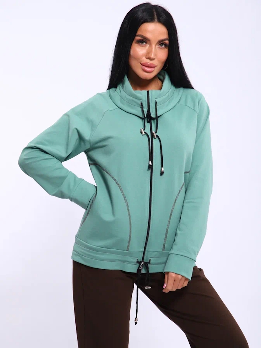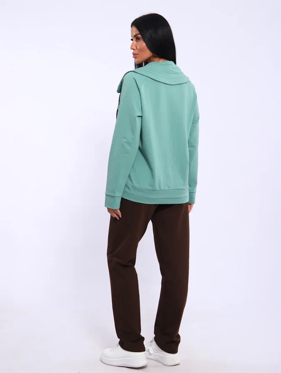 Спортивный женский костюм из эластичного футера. Брюки классического кроя без карманов на притачном поясе. Декоративный элемент в виде фиксаторов по дизайну не подбирается, может отличаться от представленного на фото.