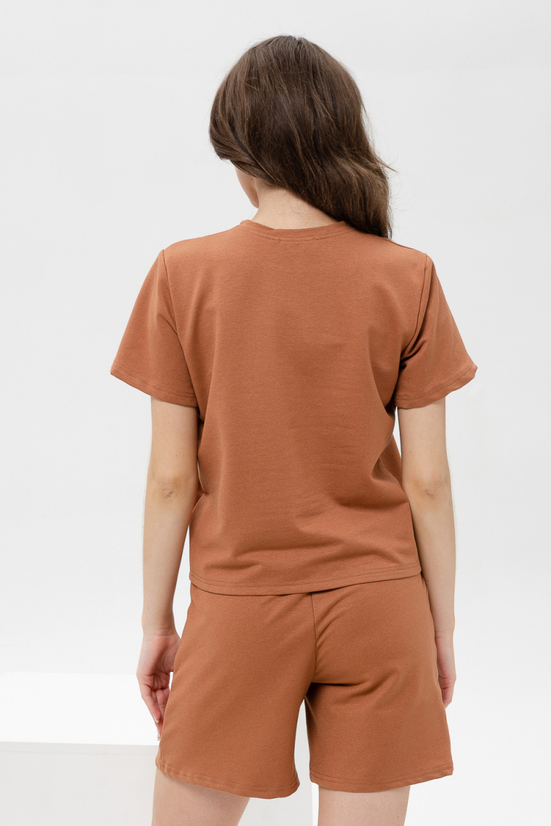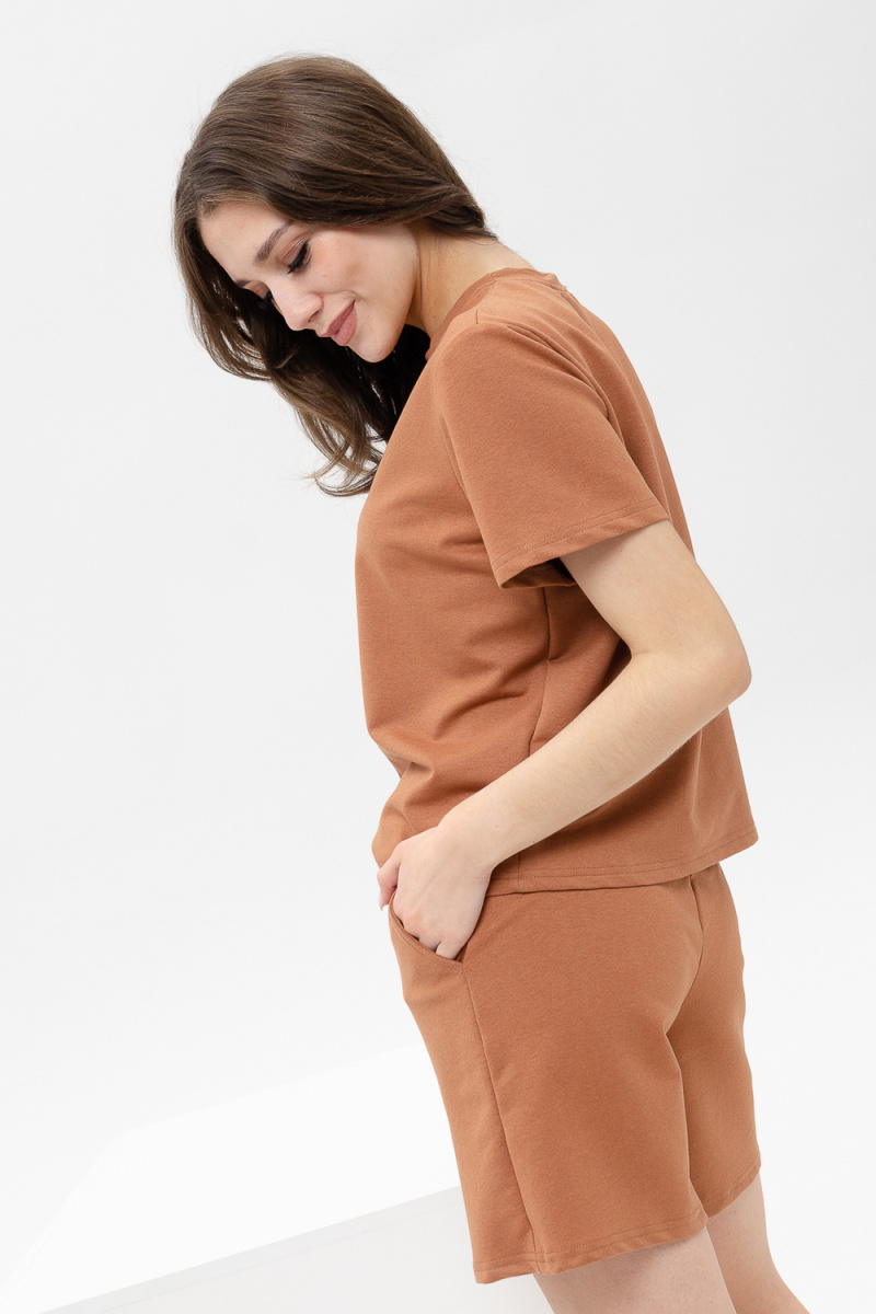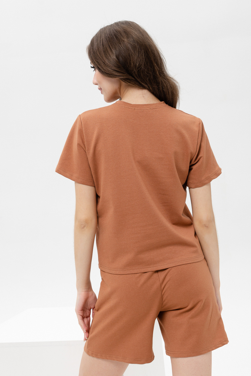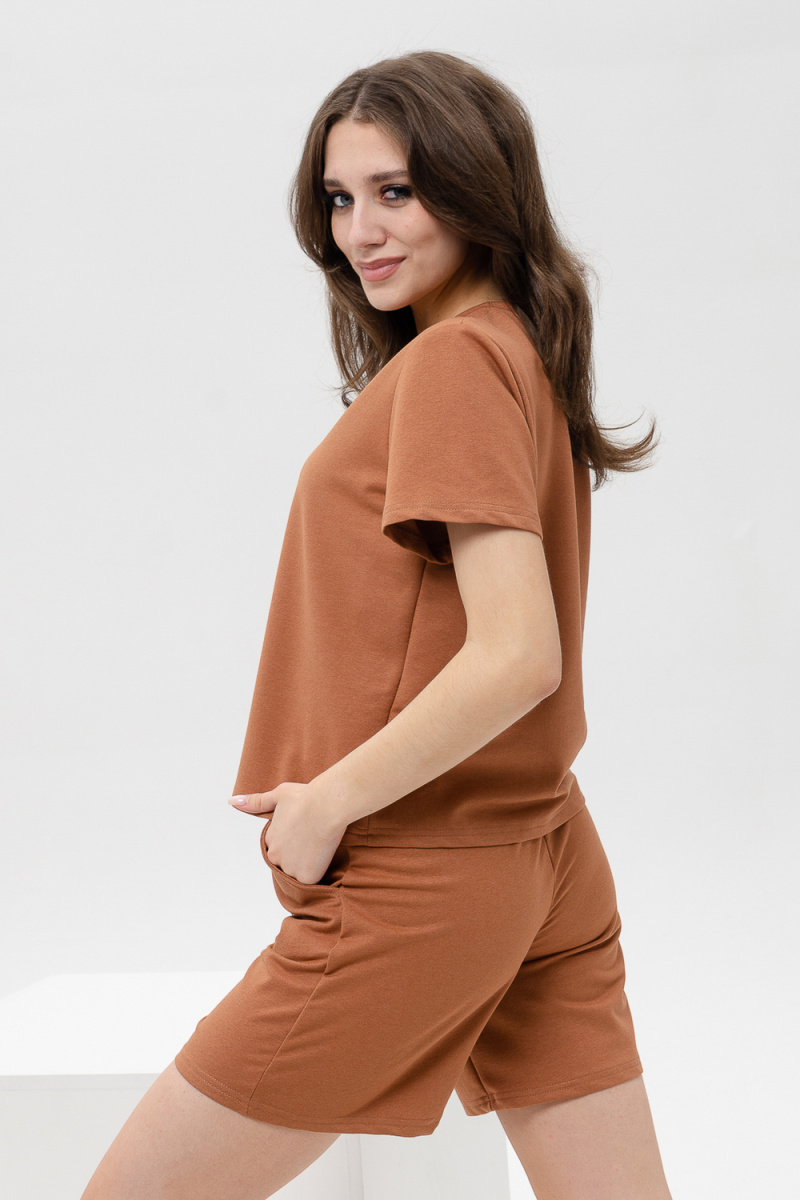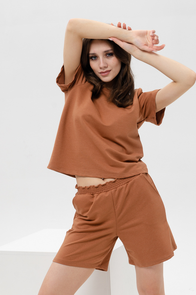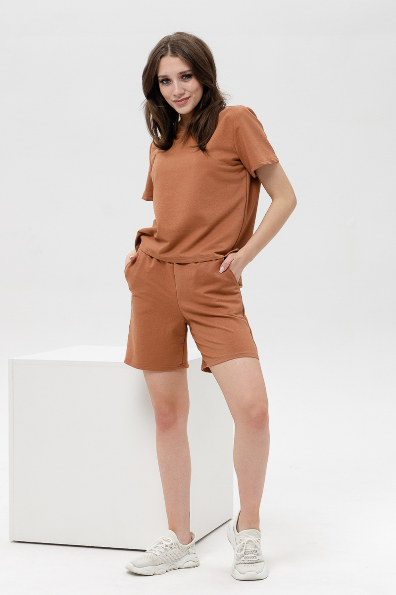 Женский костюм из футболки с шортами. Верх: однотонная футболка с коротким рукавом. Комфортная футболка для дома и занятий спортом. Актуальный крой и трендовые расцветки модели делают её универсальной для летнего гардероба. Низ: Шорты свободного покроя с карманами. Костюм спортивный в приятных модных расцветках. Комплект будет идеально смотреться как домашний и как спортивный на летний сезон. Костюм сшит из футера. Это износостойкая, приятная на ощупь, мягкая ткань из натурального хлопка. За ней легко ухаживать.