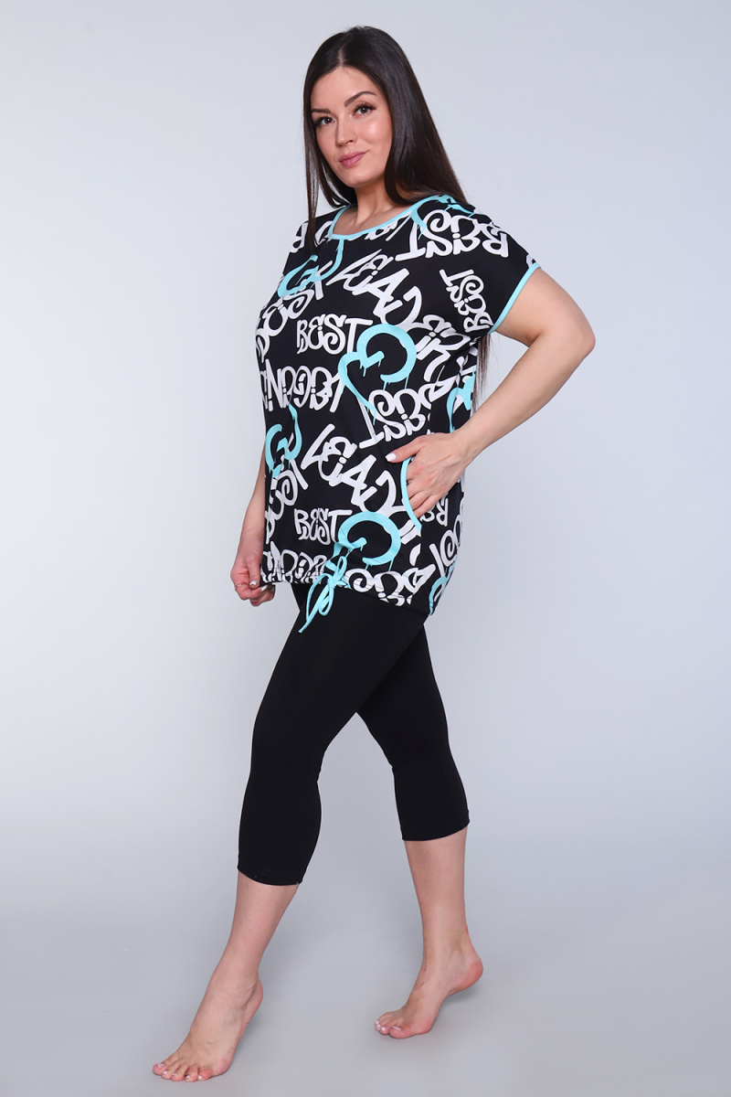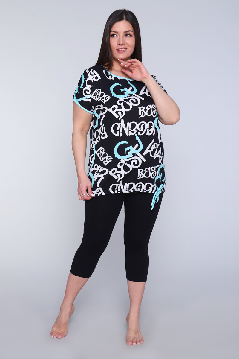 Костюм женский состоит из бриджей и кофты. Бриджи с притачной резинкой, низ изделия обработан швом в подгибку. Низ кофты обработан швом в подгибку с прокладыванием шнурка. По бокам два кармана. Входы в карман, горловина и рукава обработаны контрастной бейкой.