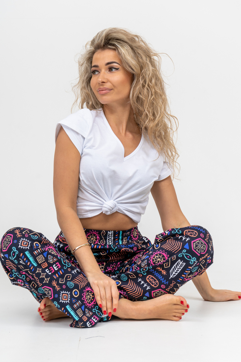 Женский стильный костюм состоит из футболки и брюк. Футболка выполнена из приятного к телу хлопчатобумажного полотна. V - образный вырез горловины и рукав с двойным крылышком идеально смотрится с брюками завышенной линии талии. Брюки - трубы в свою очередь выполнены из дышащего 100% хлопчатобумажного полотна. А вместительные боковые карманы, удобный и качественно обработанный на специальной машине пояс, позволит Вам чувствовать себя комфортно и уверенно. Костюм такого плана скроет все недостатки и подчеркнёт стройность, привлекательность и женственность фигуры. Брюки от костюма Вы можете приобрести отдельно - модель 36692, так же как и футболку - модель 36693.
