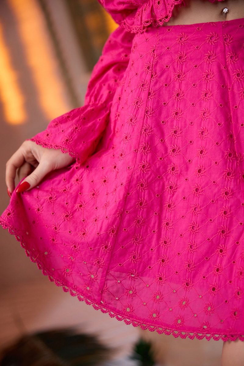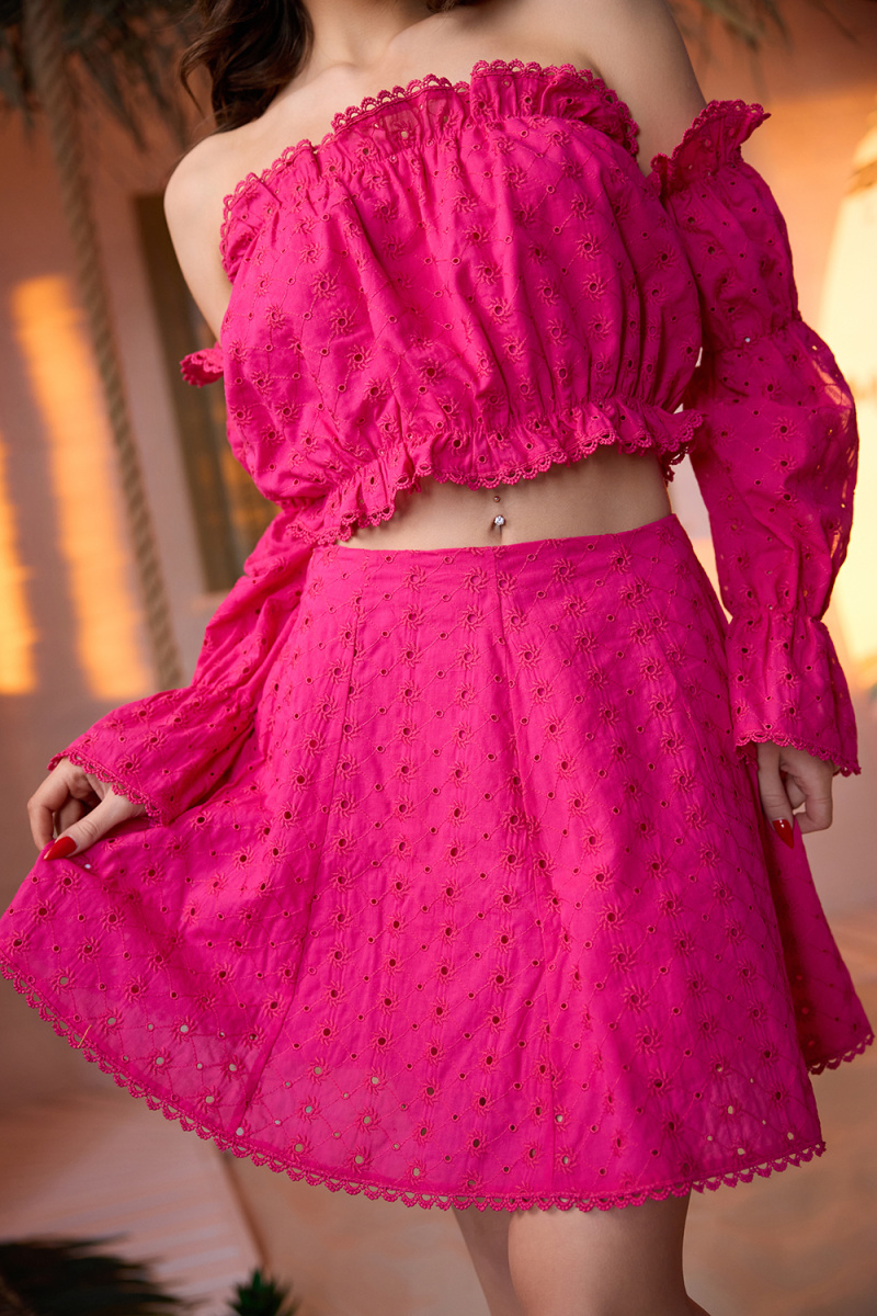 Молодежный костюм состоит из топа с открытыми плечами и с длинными рукавами, и мини юбки.