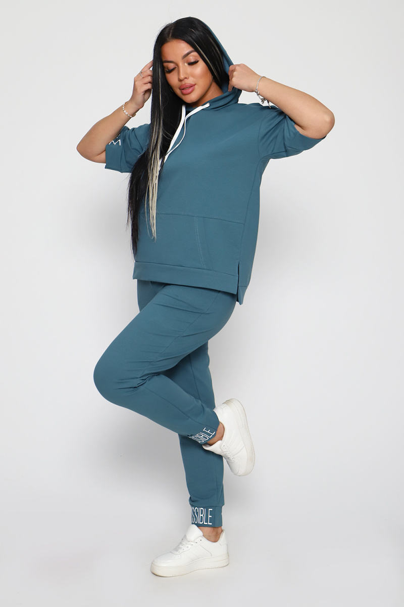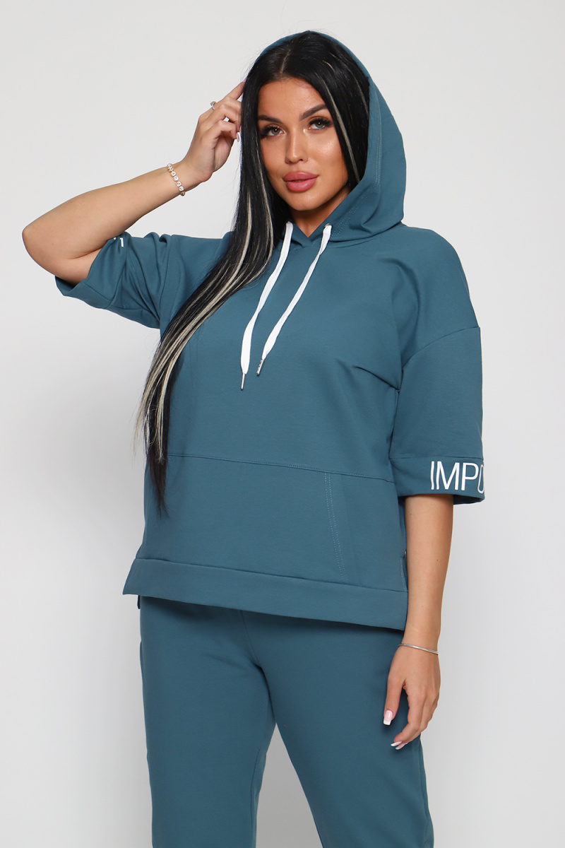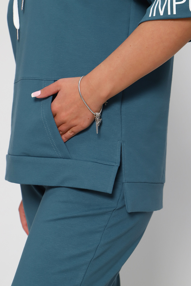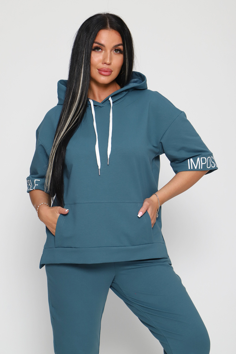 Костюм женский их футера 2‑х нитки с лайкрой. Очень интересная модель, кофта удлинённая по бокам разрезы, рукава до локтя, на манжетах принт, карман кенгуру, брюки с карманами прямой посадки снизу на манжетах. На модели 48-50 размер.