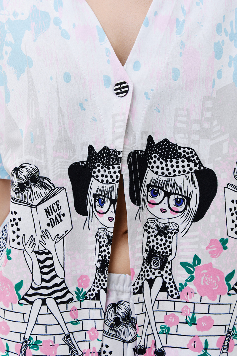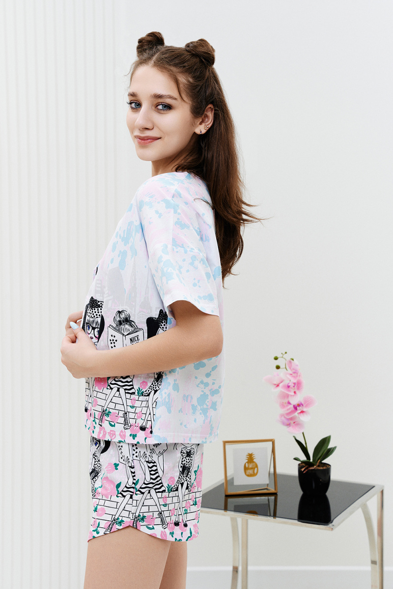 Комплект состоит из топа, шорт и короткой рубашки. Топ из эластичного полотна, на тонких бретелях, длиной выше линии талии. Горловина и бретели топа обработаны бейкой из основного полотна. Рубашка выполнена из отделочного полотна из кулирки, полуприлегающего силуэта, длиной ниже талии, с коротким рукавом, с застежкой на одну пуговицу. Горловина обработана обтачкой. Шорты широкие, на резинке.