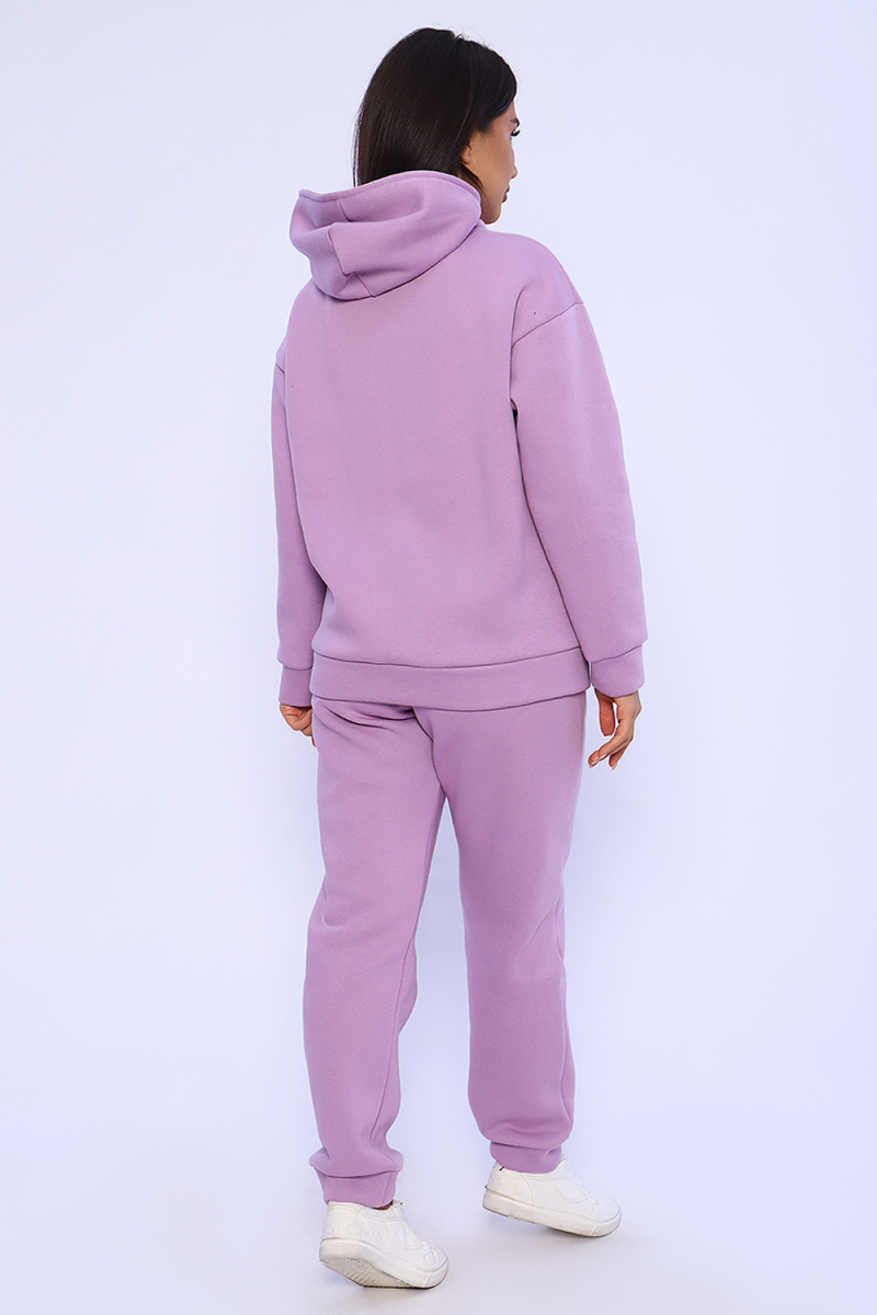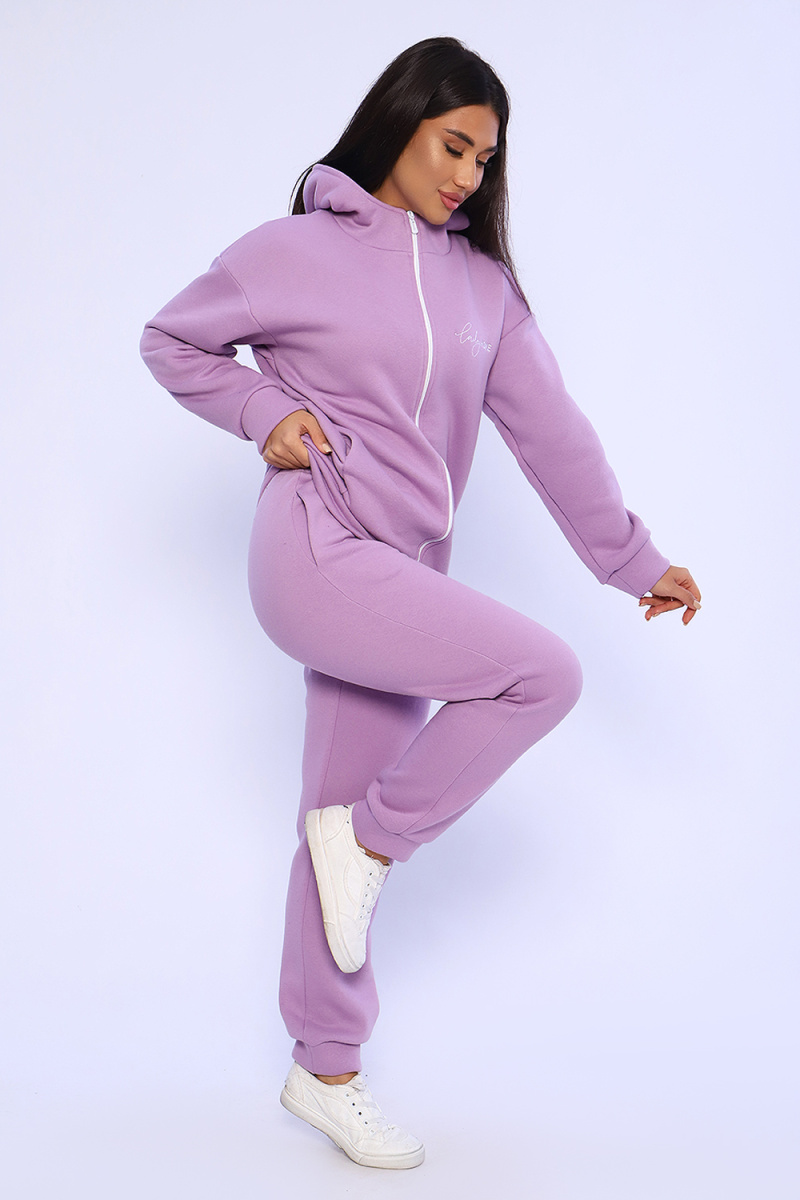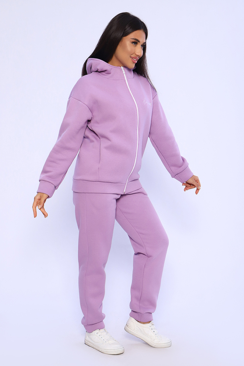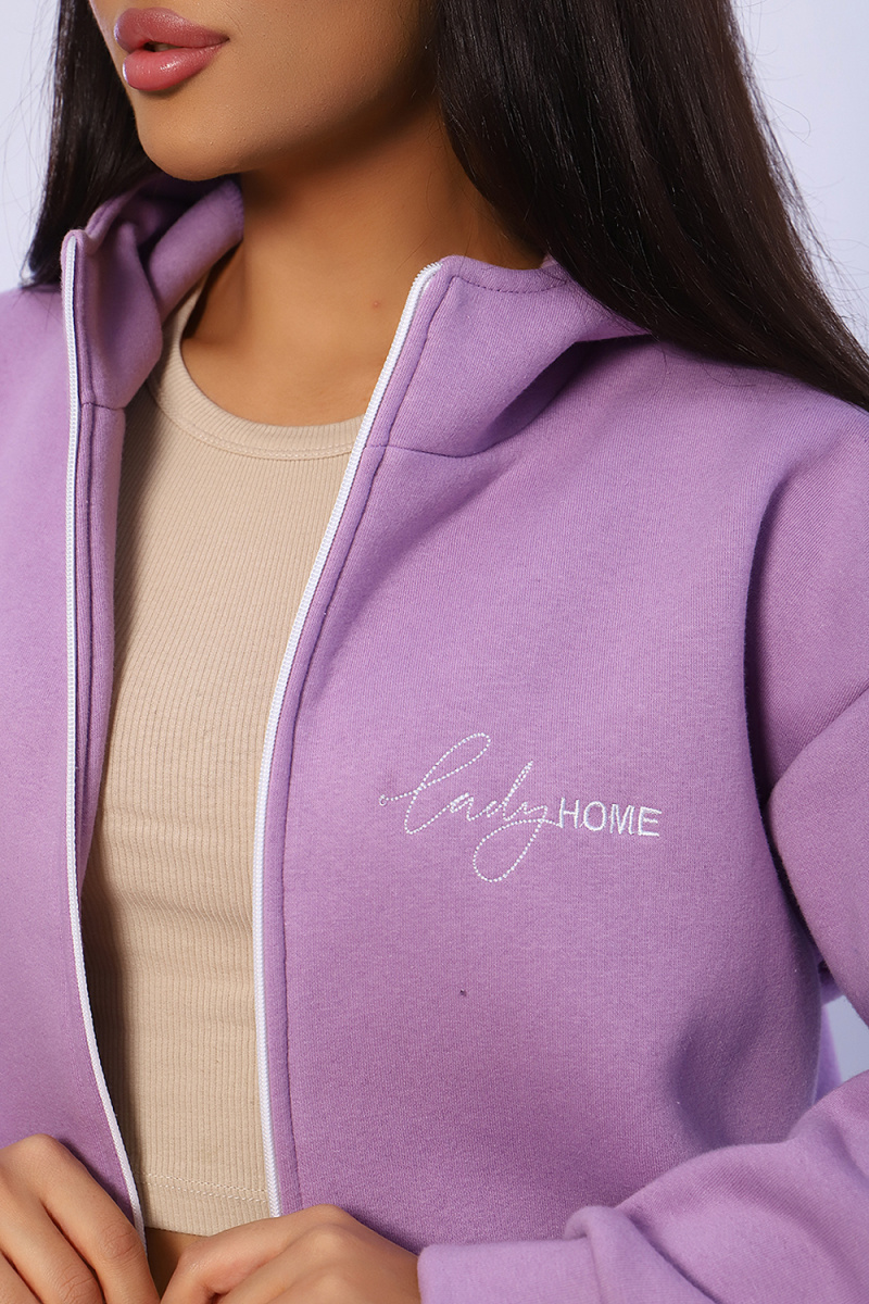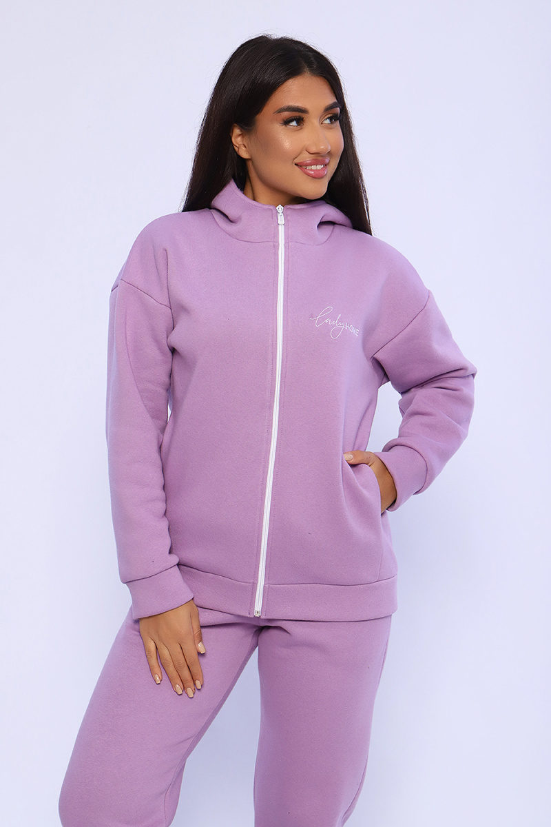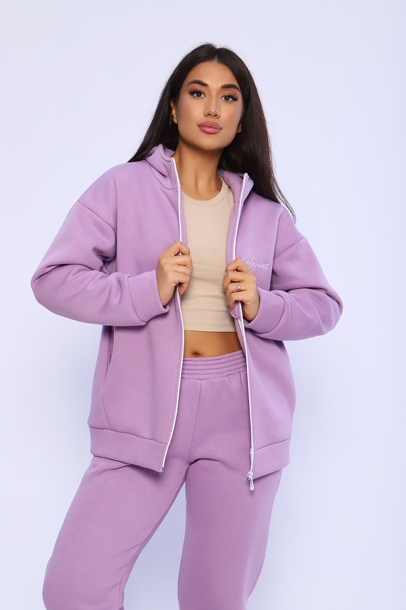Женский костюм из футера 3-х нитки с начесом. Костюм состоит из толстовки и брюк. Толстовка свободная на молнии с капюшоном, на полочке оригинальная вышивка Lady HOME, по боковому шву в шве карман. Толстовка со спущенным рукавом на манжете. Брюки свободные. По боковому шву карман в шве, низ брюк на манжете. Пояс обработан на поясной машине, что делает брюки практичными при носке – резинка не скручивается. Костюм теплый, удобный, комфортный. Идеальное решение для повседневной носки в прохладную погоду!