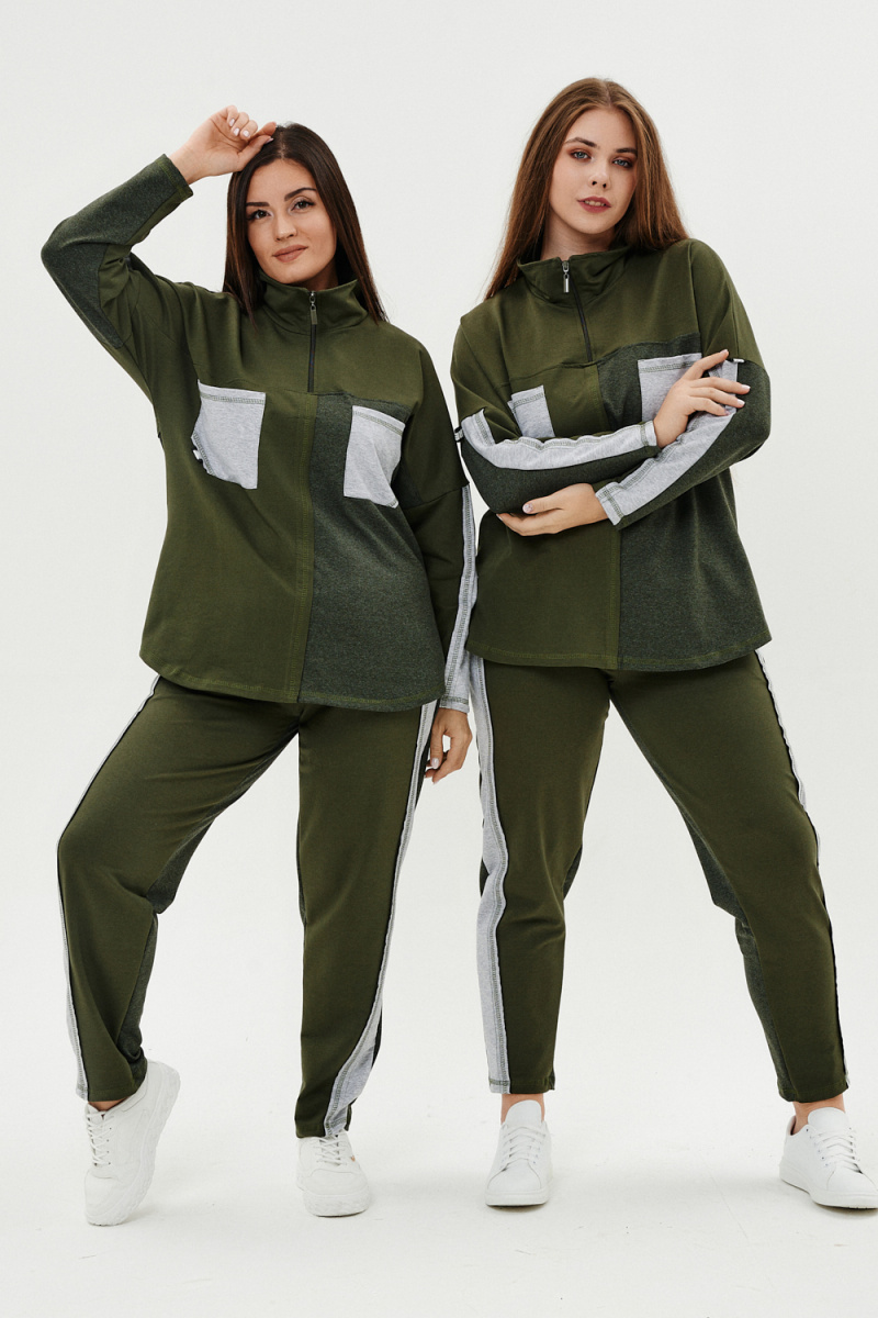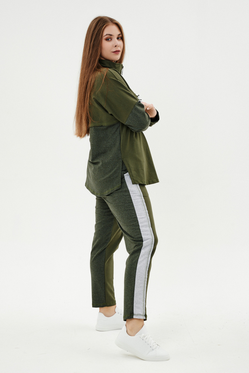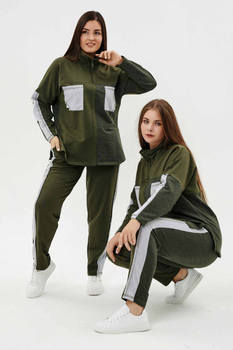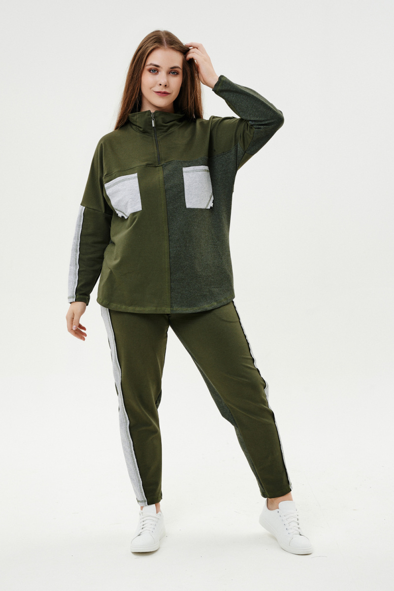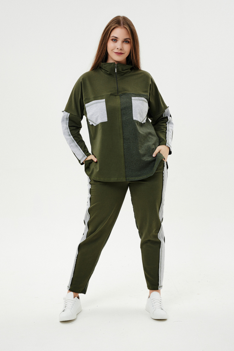 Костюм женский: толстовка и брюки. Толстовка прямого силуэта, брюки свободные по бедрам, зауженные к низу. Рукав цельнокроенный со швом. Воротник-стойка застегивается на тесьму-молнию. В костюме удачно сочетается однотонный футер с меланжированным. На спинке и полочке кокетки. Нагрудные карманы, лампасы на рукавах и брюках из контрастной отделочной ткани. На передних половинках брюк внутренние карманы.