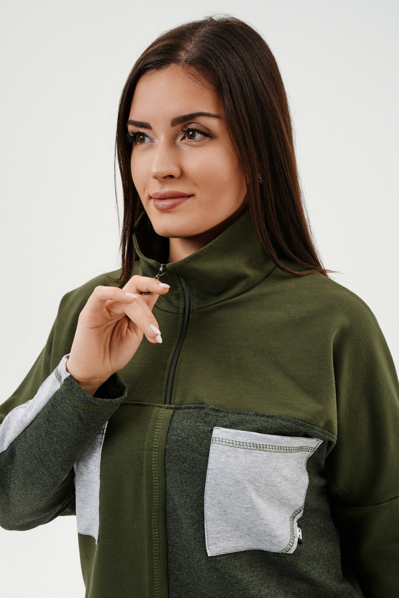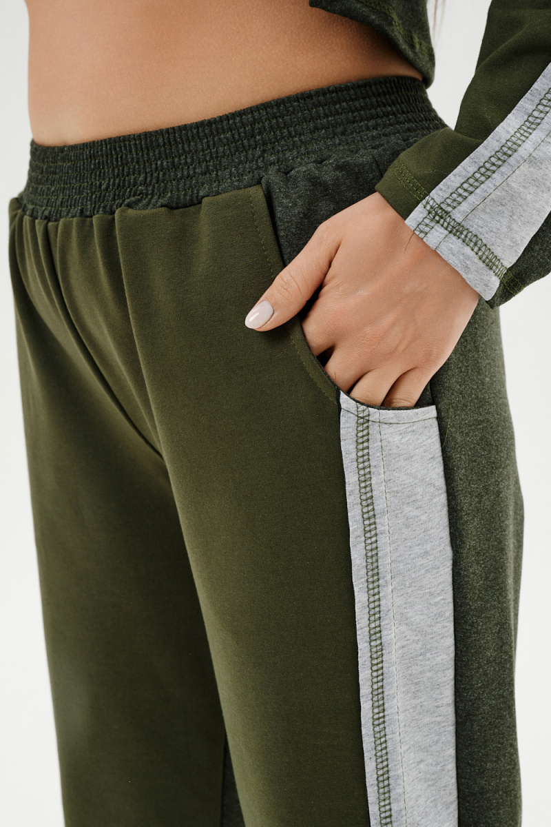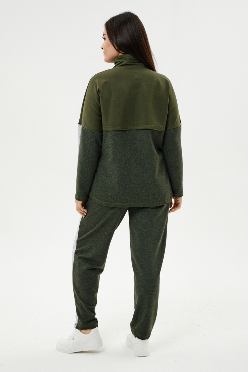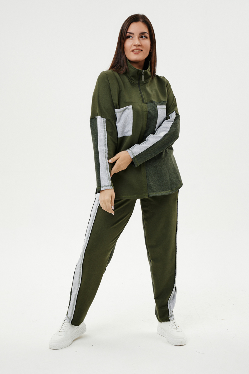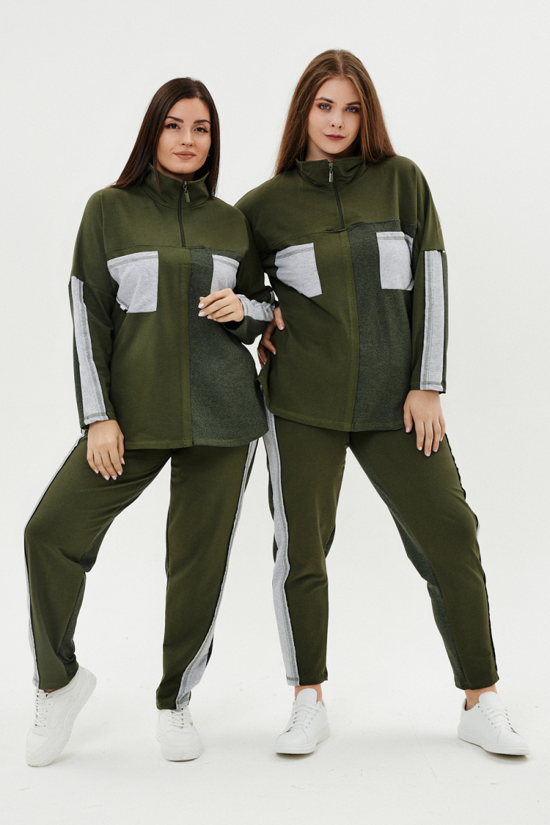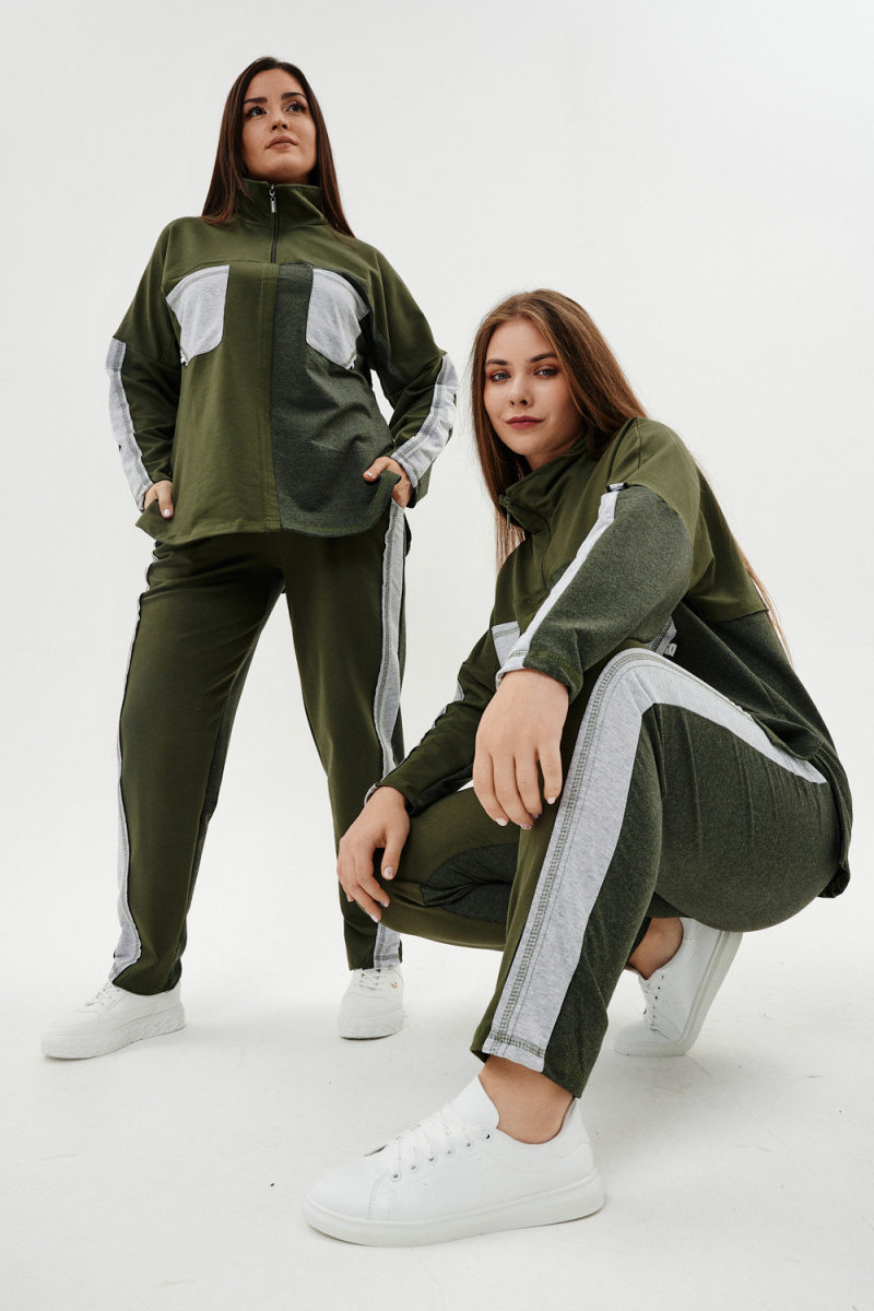 Костюм женский: толстовка и брюки. Толстовка прямого силуэта, брюки свободные по бедрам, зауженные к низу. Рукав цельнокроенный со швом. Воротник-стойка застегивается на тесьму-молнию. В костюме удачно сочетается однотонный футер с меланжированным. На спинке и полочке кокетки. Нагрудные карманы, лампасы на рукавах и брюках из контрастной отделочной ткани. На передних половинках брюк внутренние карманы.