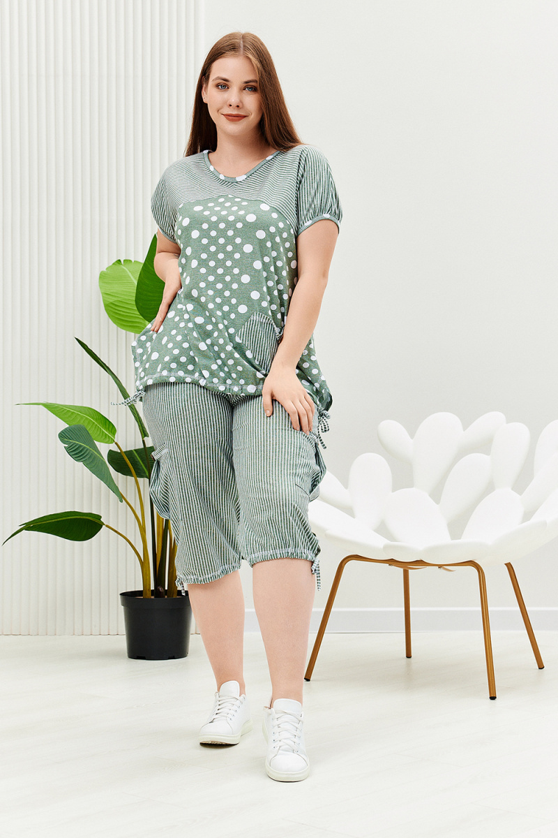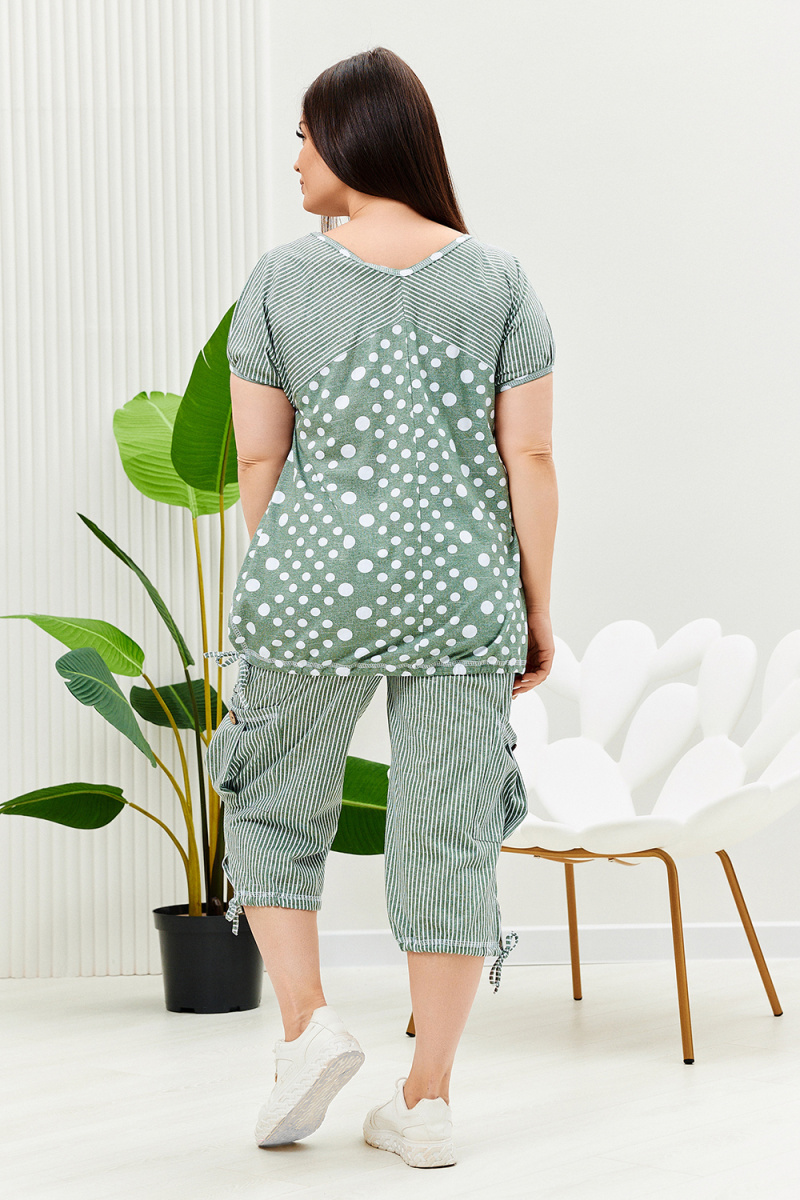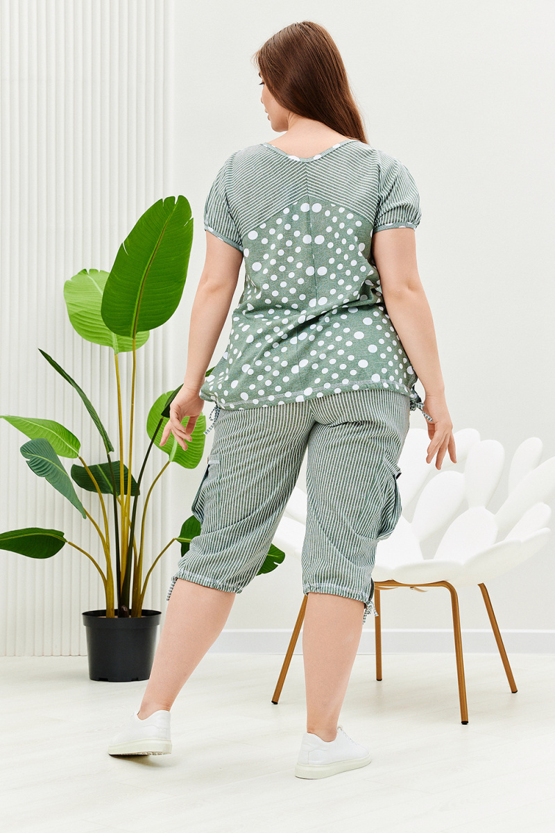 Костюм женский, туника и бриджи. Туника расширенная к низу с боковыми разрезами, низ фиксируется завязками. Горловина Y-образная, рукав короткий цельнокроенный, около плечевого шва небольшая сборка. Кокетка полочки и спинки из двух частей в полоску, соединяющихся под наклоном. На полочке накладной фигурный карман. Бриджи прямого силуэта, внизу брюк разрезы и утяжки. На передних частях внутренние карманы и боковые с бантовой складкой. Пояс выполнен на многоигольной машине.