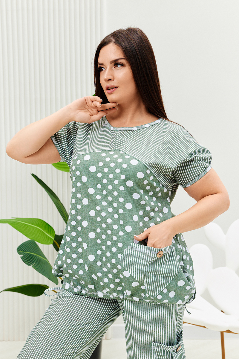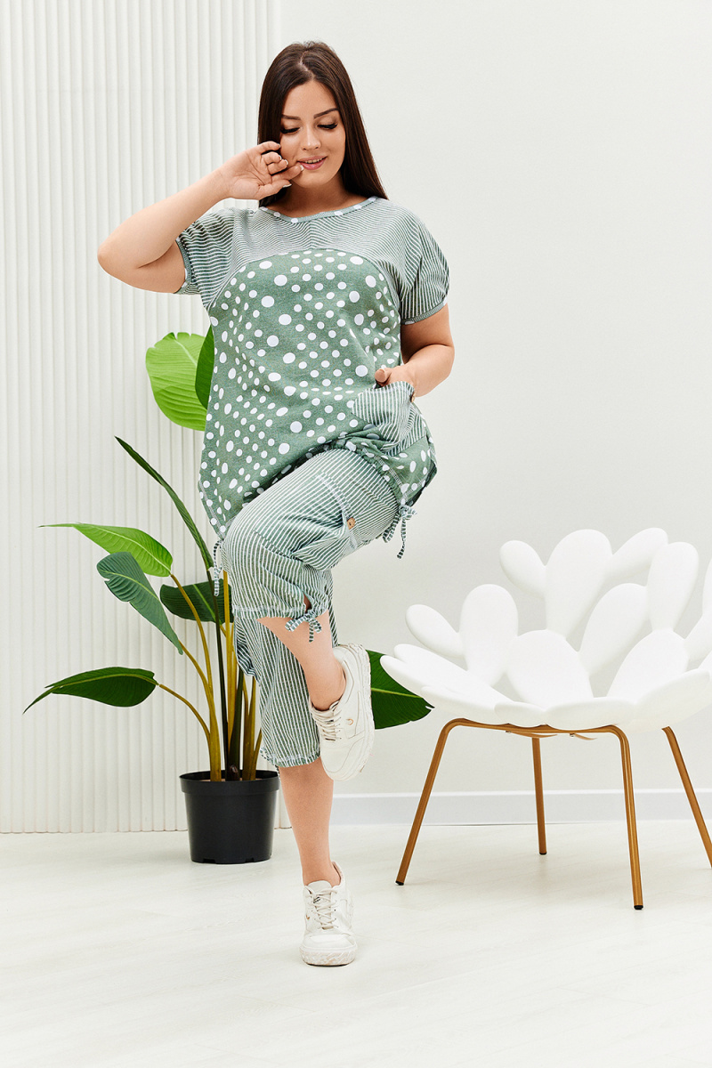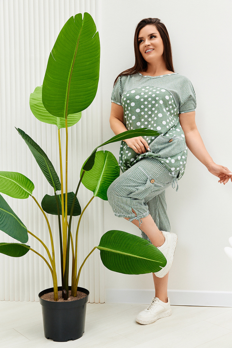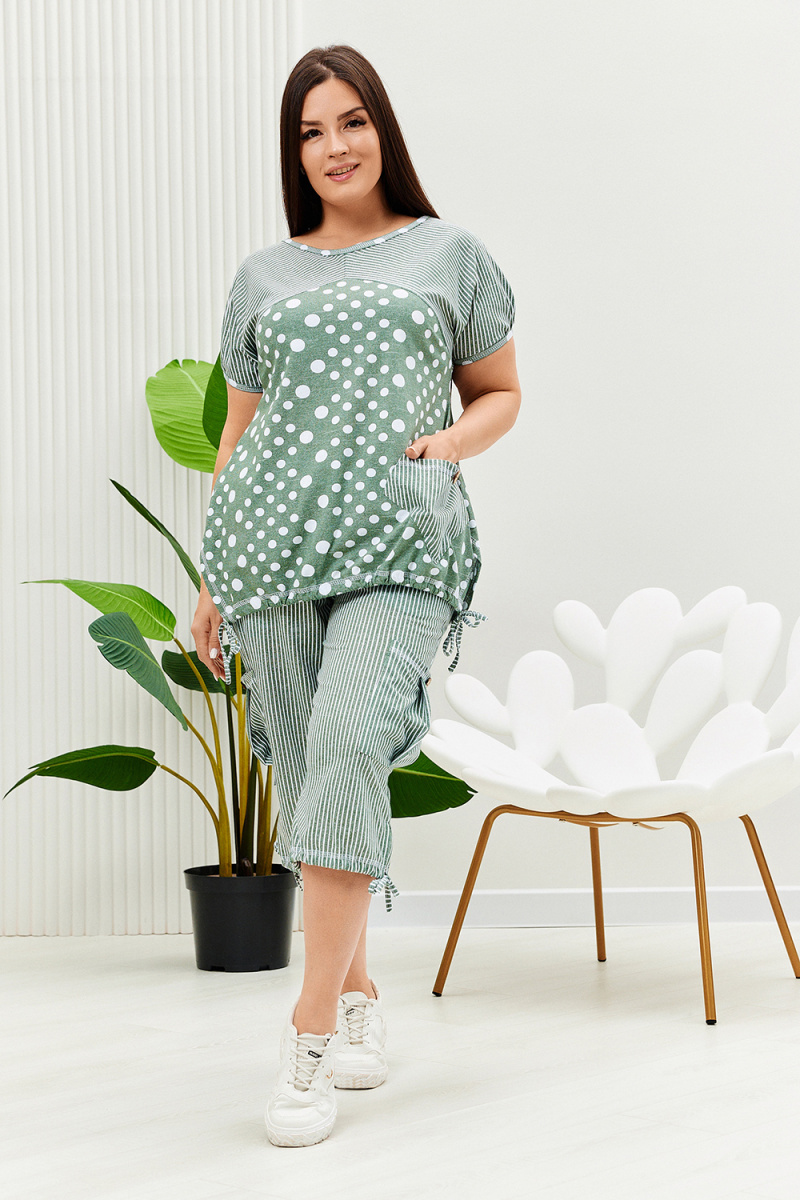 Костюм женский, туника и бриджи. Туника расширенная к низу с боковыми разрезами, низ фиксируется завязками. Горловина Y-образная, рукав короткий цельнокроенный, около плечевого шва небольшая сборка. Кокетка полочки и спинки из двух частей в полоску, соединяющихся под наклоном. На полочке накладной фигурный карман. Бриджи прямого силуэта, внизу брюк разрезы и утяжки. На передних частях внутренние карманы и боковые с бантовой складкой. Пояс выполнен на многоигольной машине.