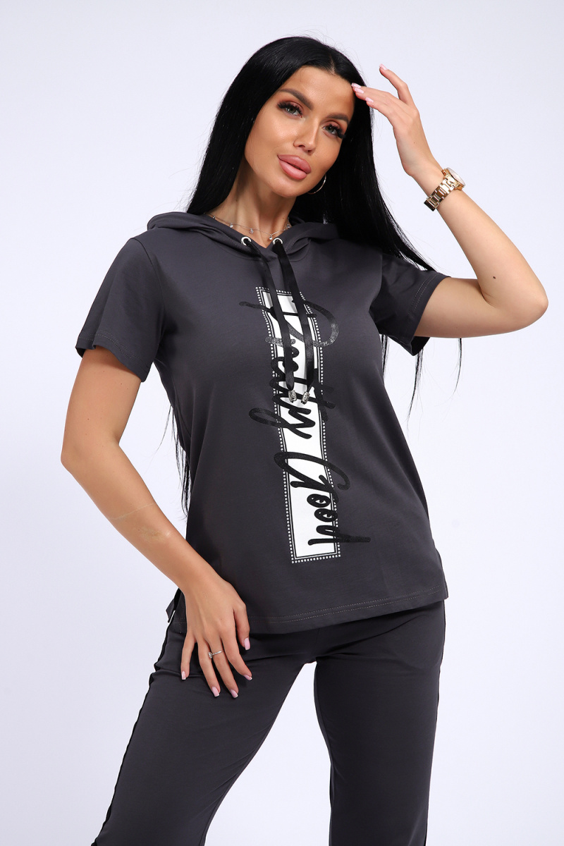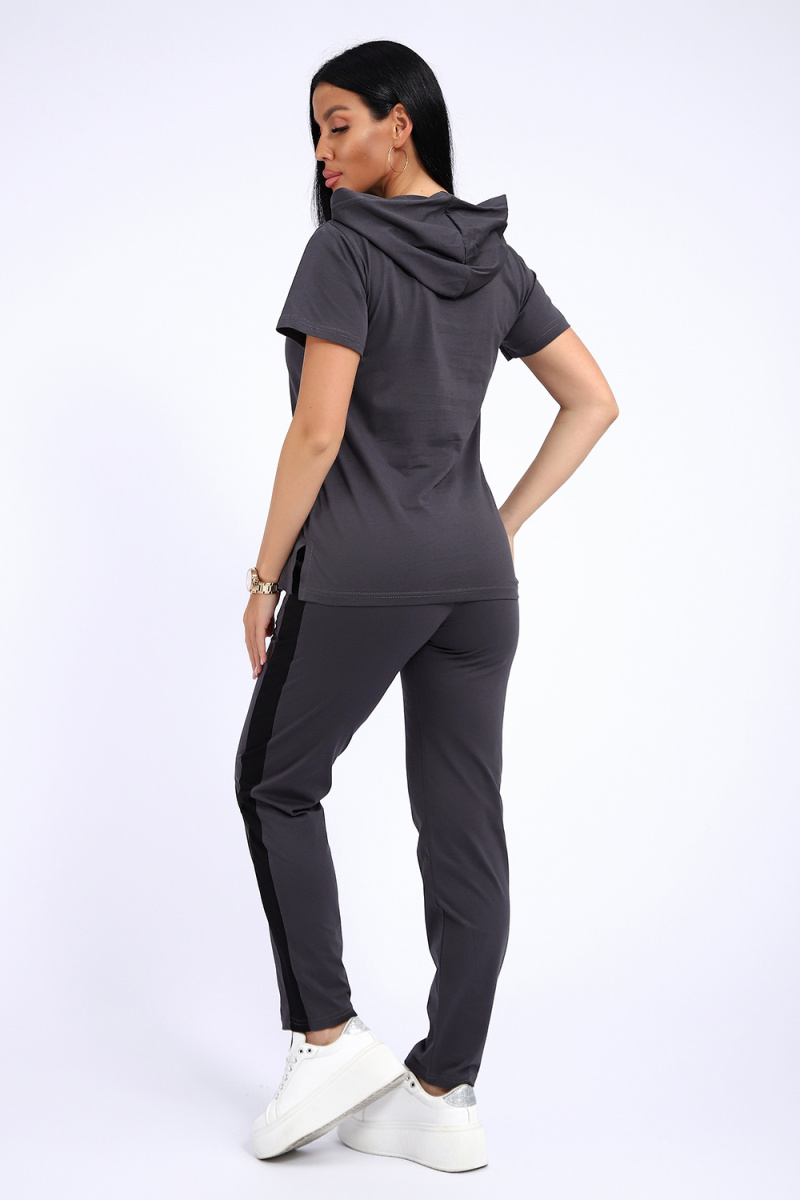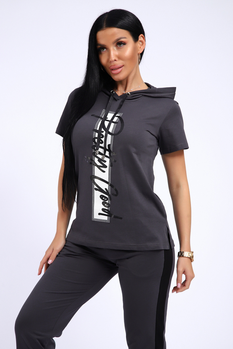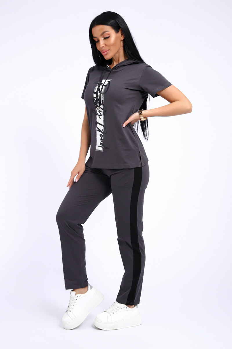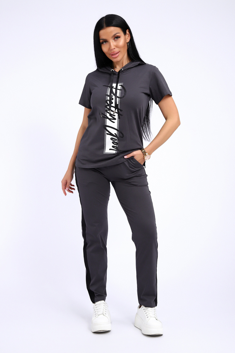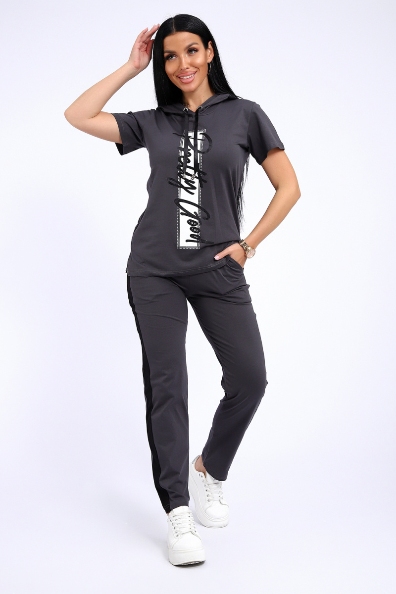 Стильный женский костюм из легкой дышащей ткани. Сшит из мягкого трикотажного полотна высокого качества. Основной изюминкой костюма является яркий принт на полочке кофты, расположенный вертикально и контрастирующий с общим фоном. Кроме того, на кофте имеется капюшон, объем которого регулируется тонкой лентой. Этот универсальный и практичный повседневный костюм в спортивном стиле будет удобным и комфортным во многих ситуациях. Комплект отлично подойдет для спорта, бега или танцев. Брюки свободные с яркими лампасами, двумя боковыми карманами, на широком поясе с резинкой. Каждую вещь вполне можно использовать по отдельности. Комплект отлично подойдет для женщин любого возраста и поможет хозяйке выглядеть стильно, при этом даря чувство комфорта!