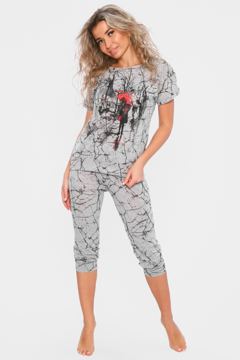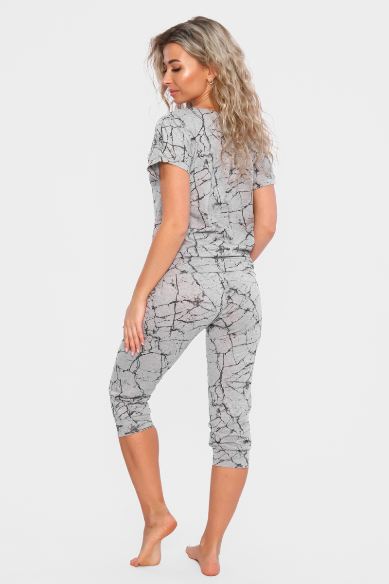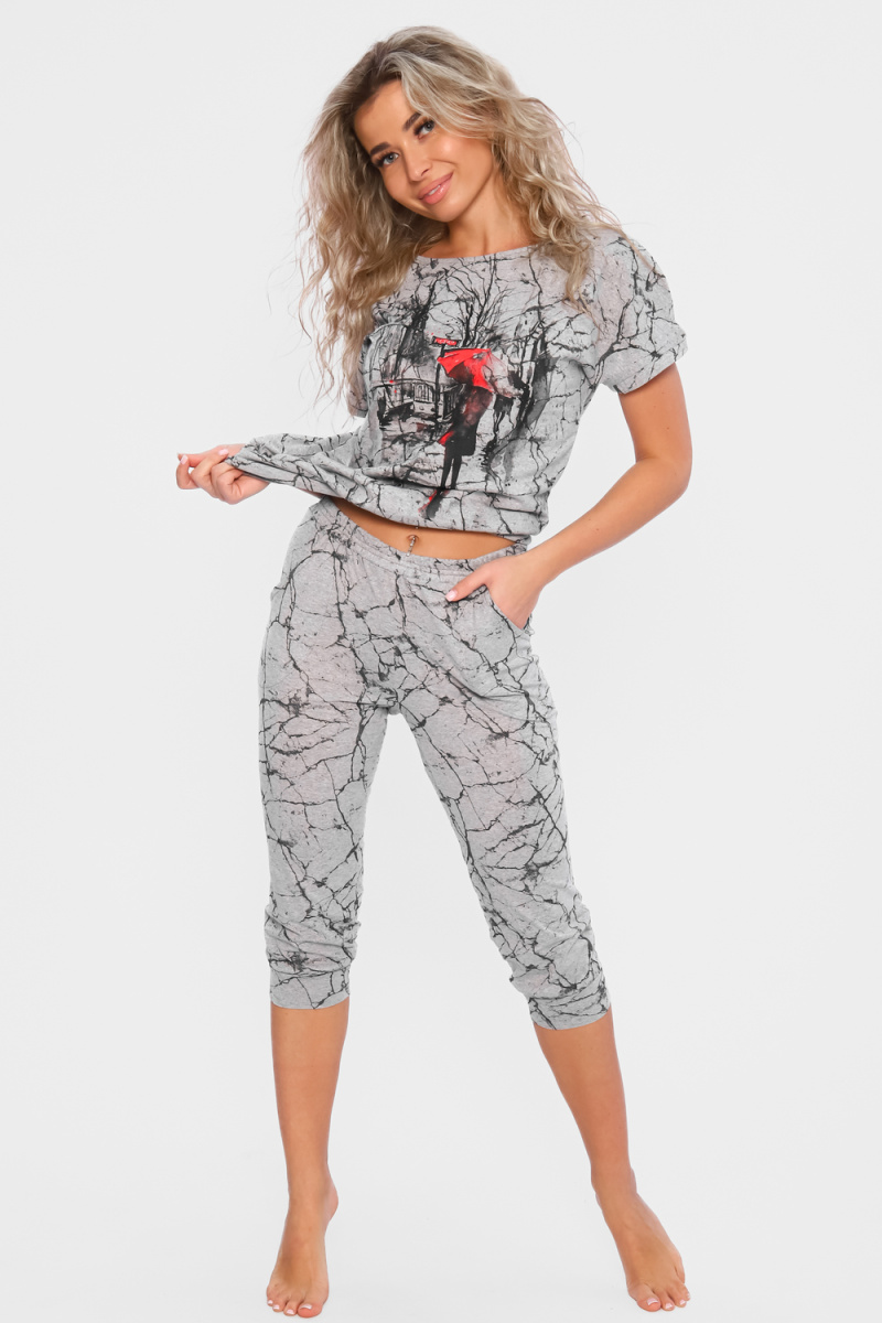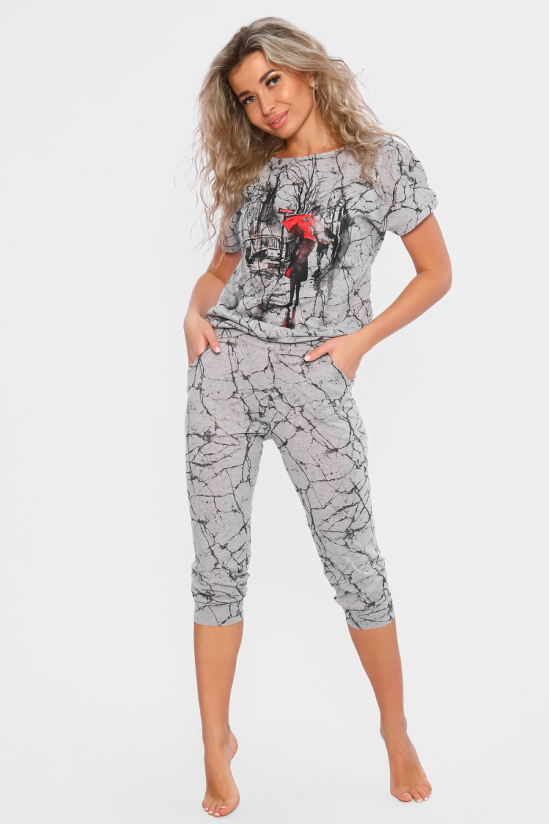 Костюм повседневный, универсального назначения для работы и отдыха. Футболка с цельнокроеным удлиненным рукавом на манжете, горловина "лодочка" по низу притачной пояс, бриджи с внутренними карманами и манжетой по низу.