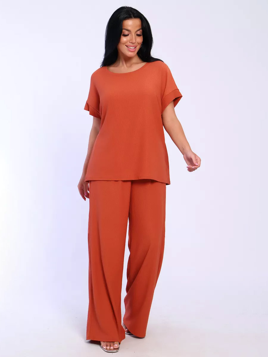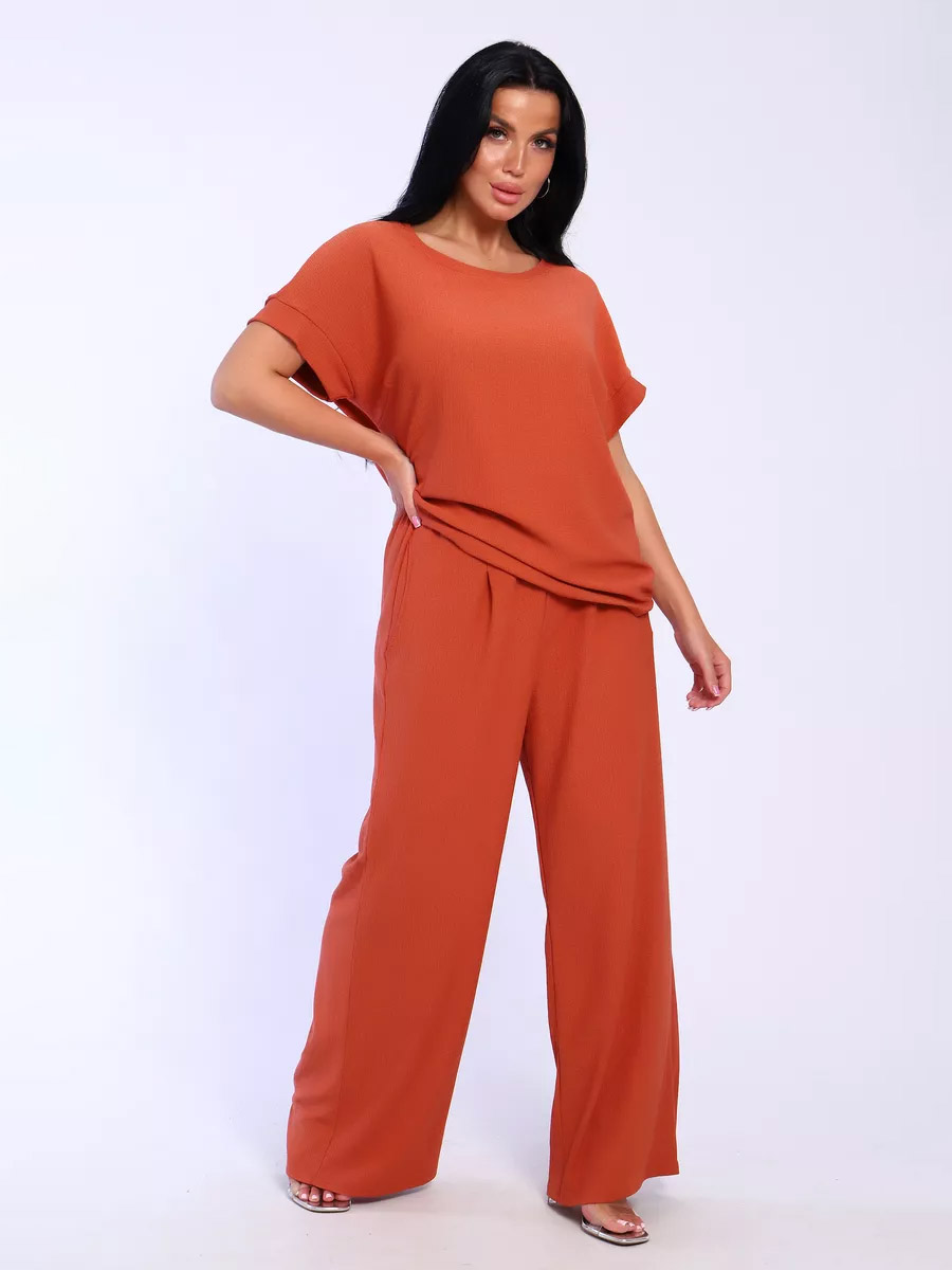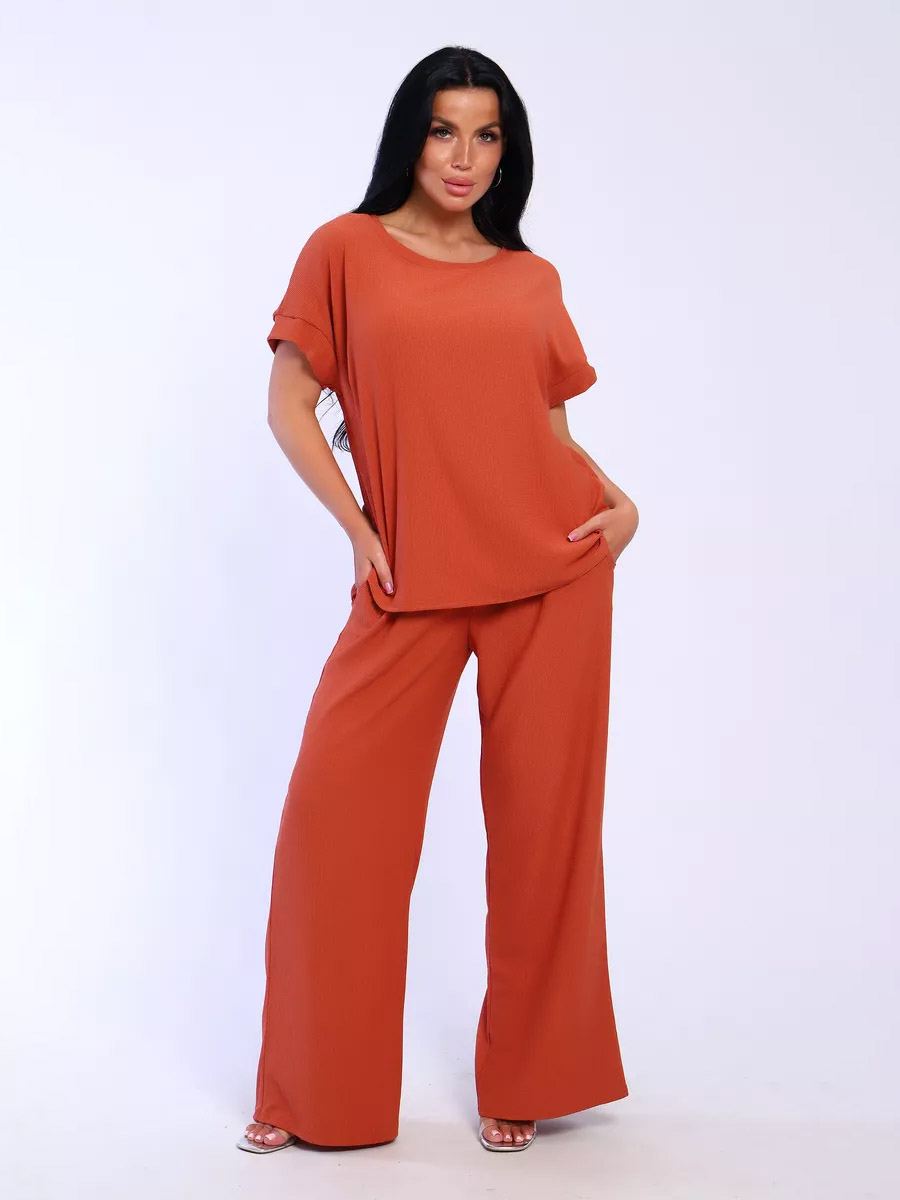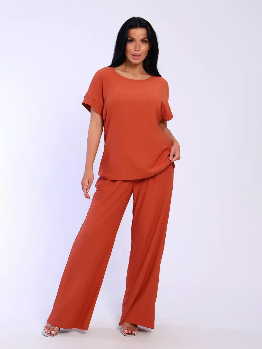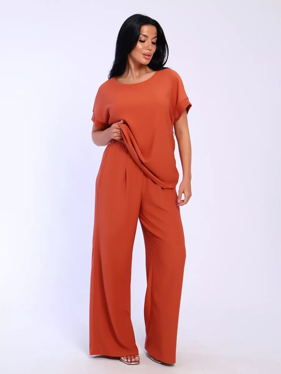 Брюки палаццо и футболка со спущенной проймой и с круглым вырезом горловины из тонкого, струящего материала - жатка. Такой красивый модный костюм не оставит равнодушной ни одну модницу. Вещи представлены стандартных и больших размеров для дам с пышными формами. Расклешенные брючки с завышенной талией на резинке с карманами отличаются удобным кроем, они стандартной длины и превосходно садятся по фигуре женщин, визуально удлиняют ноги и придают силуэту идеальные очертания. Благодаря наличию нагрудных вытачек футболка идеально садиться по фигуре.