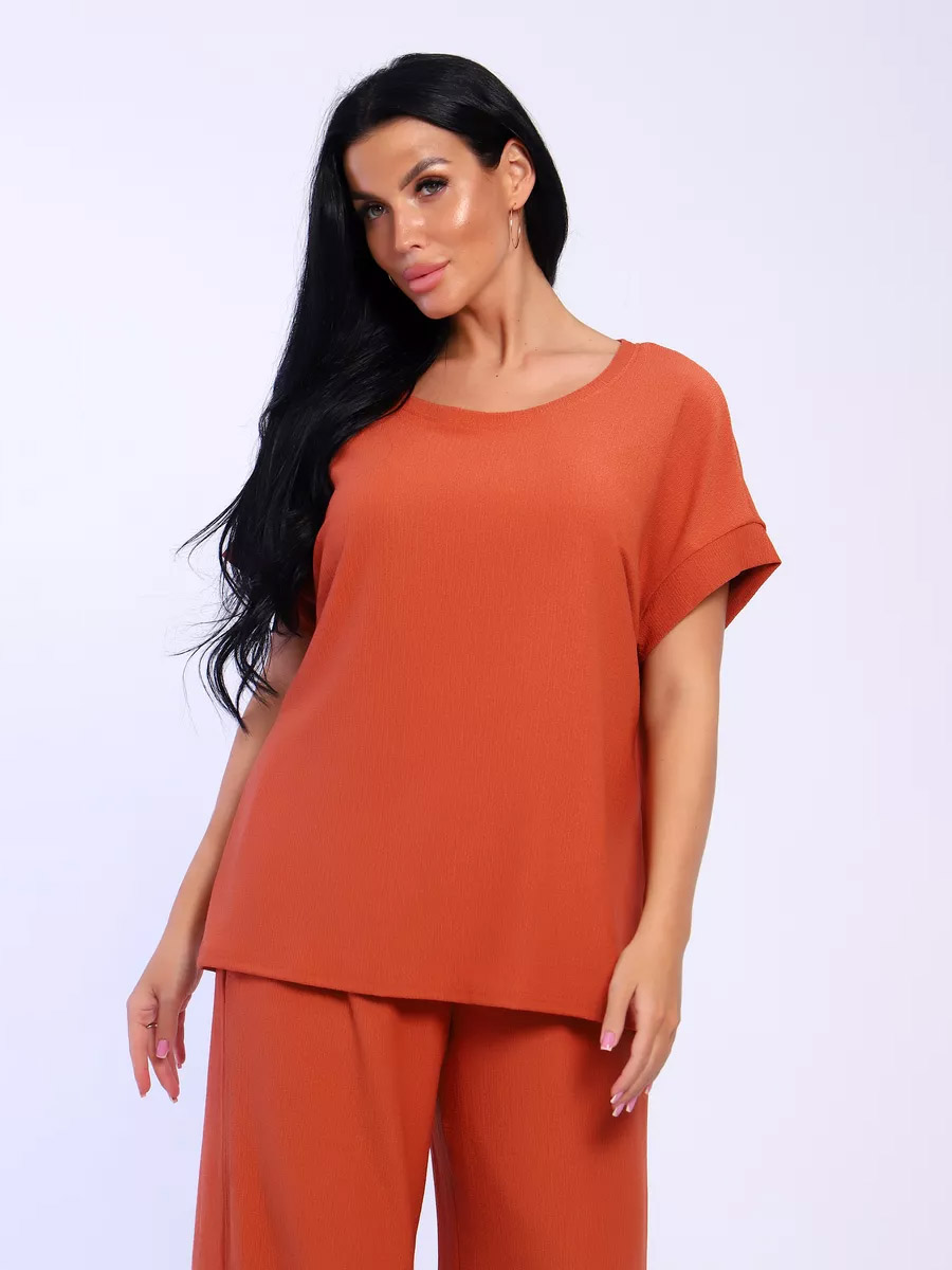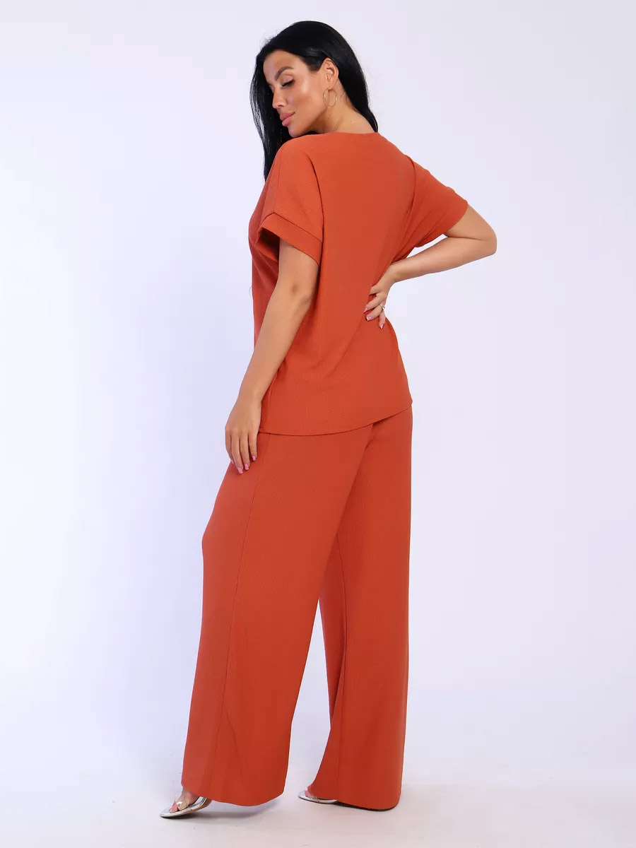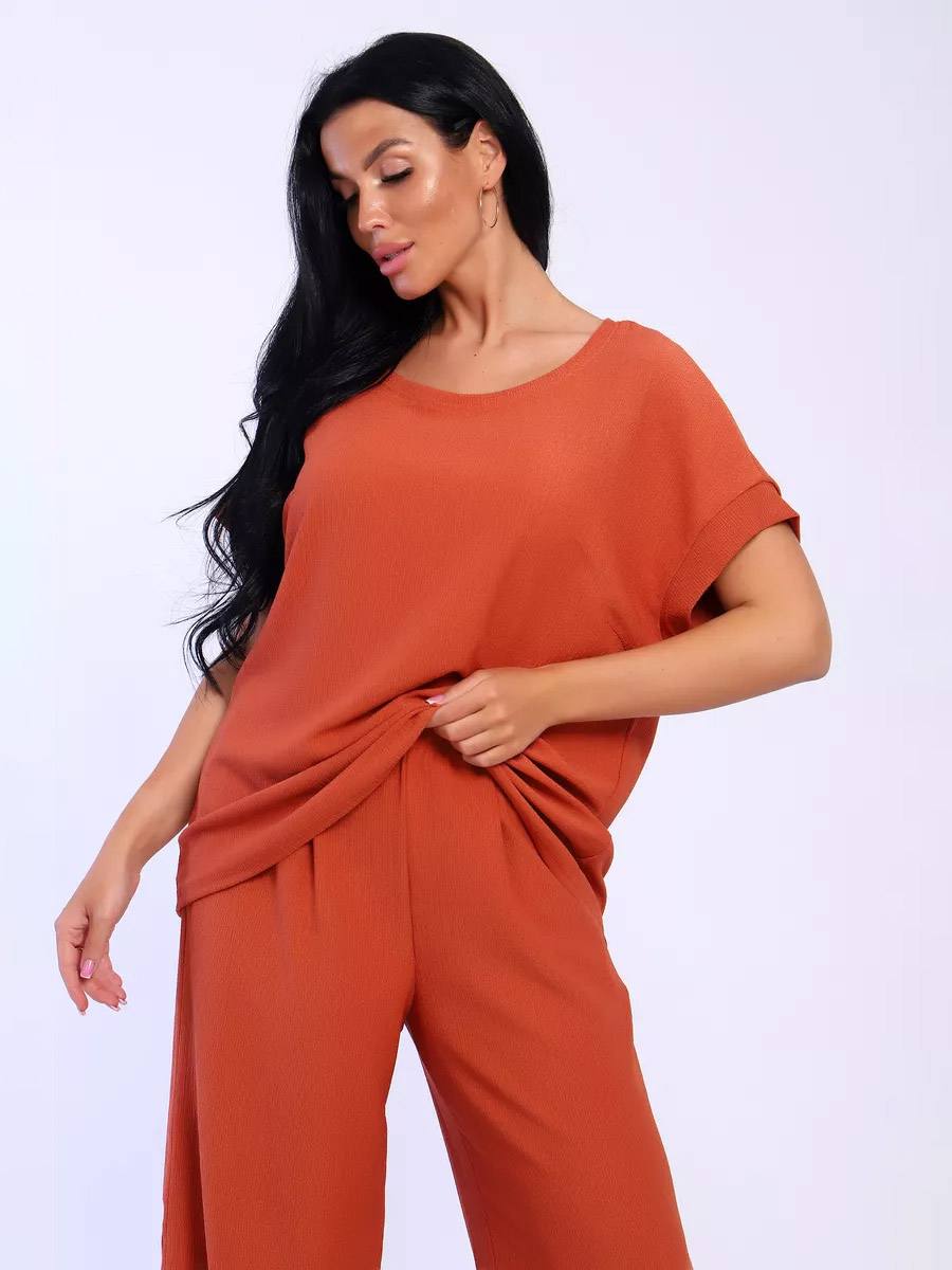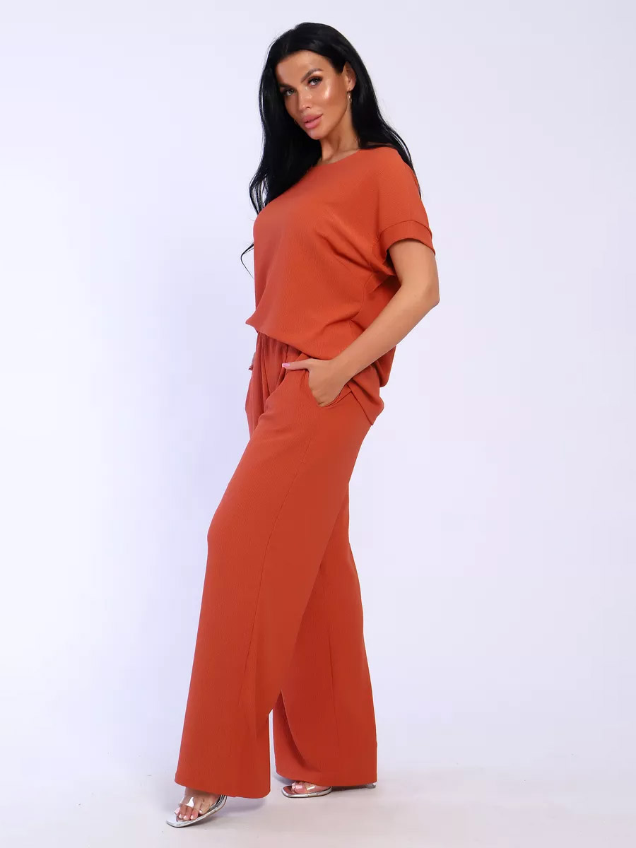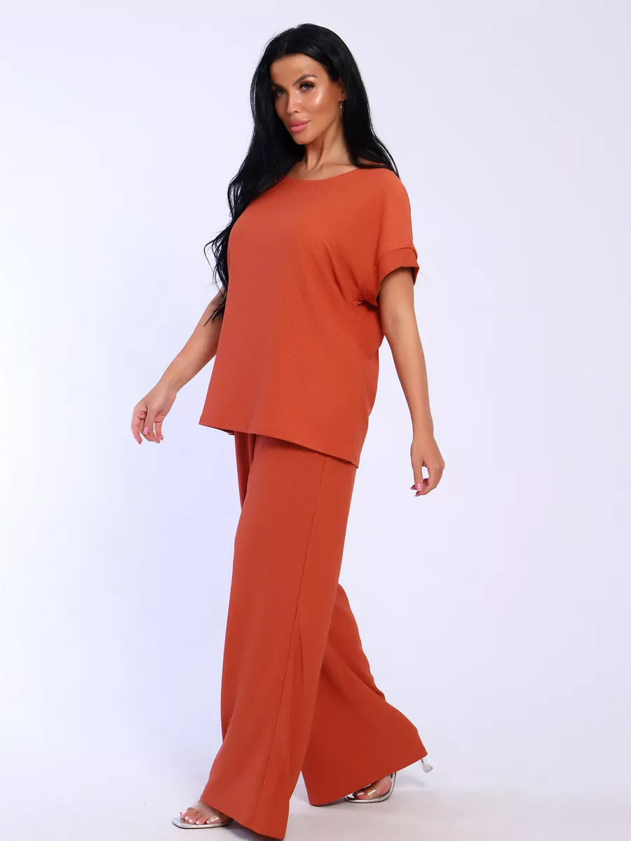 Брюки палаццо и футболка со спущенной проймой и с круглым вырезом горловины из тонкого, струящего материала - жатка. Такой красивый модный костюм не оставит равнодушной ни одну модницу. Вещи представлены стандартных и больших размеров для дам с пышными формами. Расклешенные брючки с завышенной талией на резинке с карманами отличаются удобным кроем, они стандартной длины и превосходно садятся по фигуре женщин, визуально удлиняют ноги и придают силуэту идеальные очертания. Благодаря наличию нагрудных вытачек футболка идеально садиться по фигуре.
