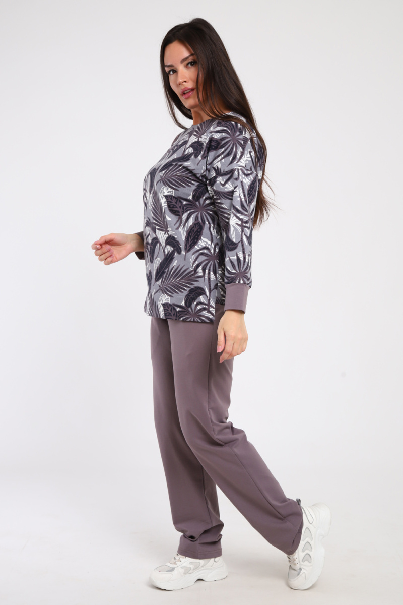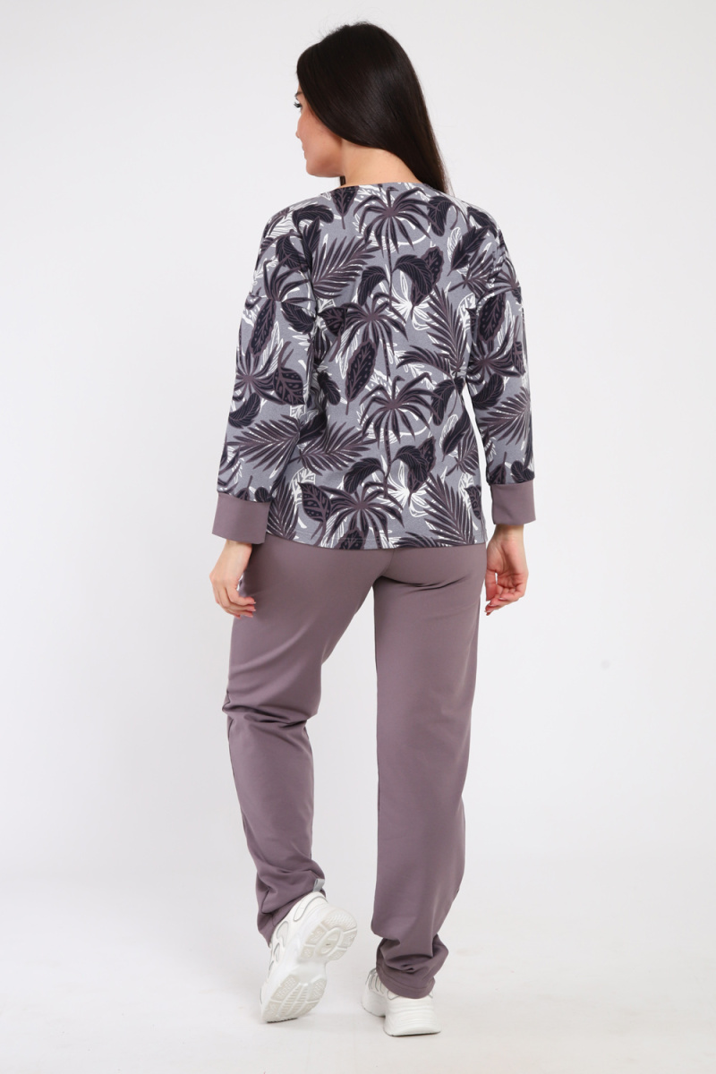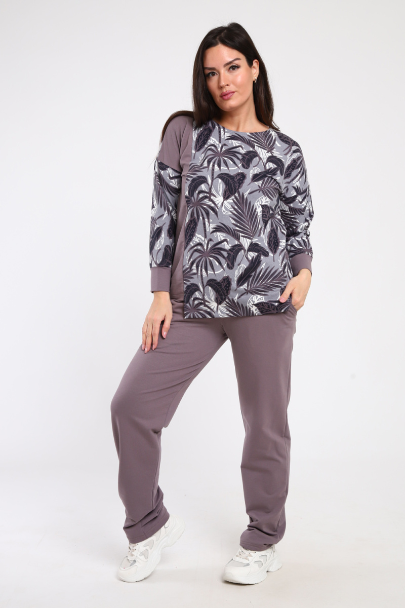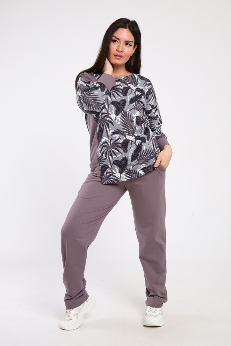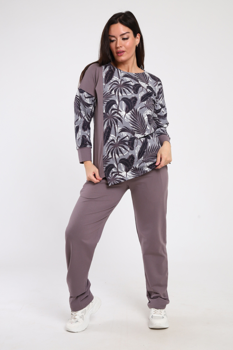 Комбинированный костюм оригинально смотрится на любой фигуре, с легкостью совмещая в себе элегантность и комфорт. Джемпер со спущенным рукавом. Брюки прямого покроя с карманами, посадка средняя. Трикотажный женский костюм предназначен для девушек, ценящих комфорт, удобство. Подойдет для прогулок в кино с друзьями, путешествий, работы в офисе, праздника, а также как вечерний модный образ на свидание.