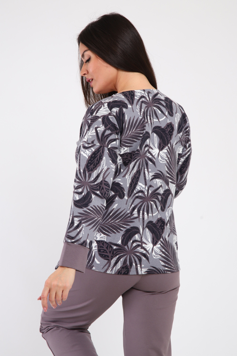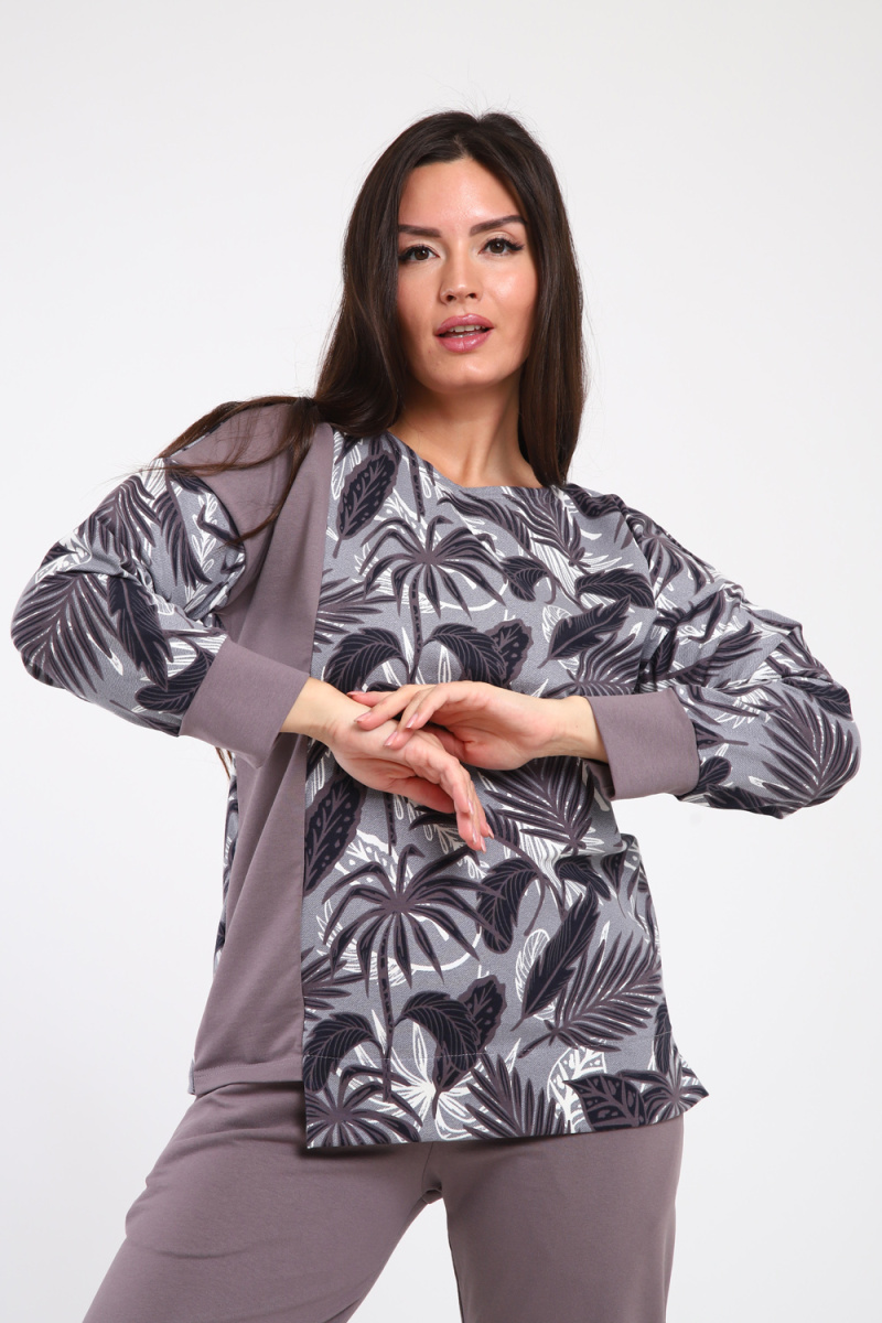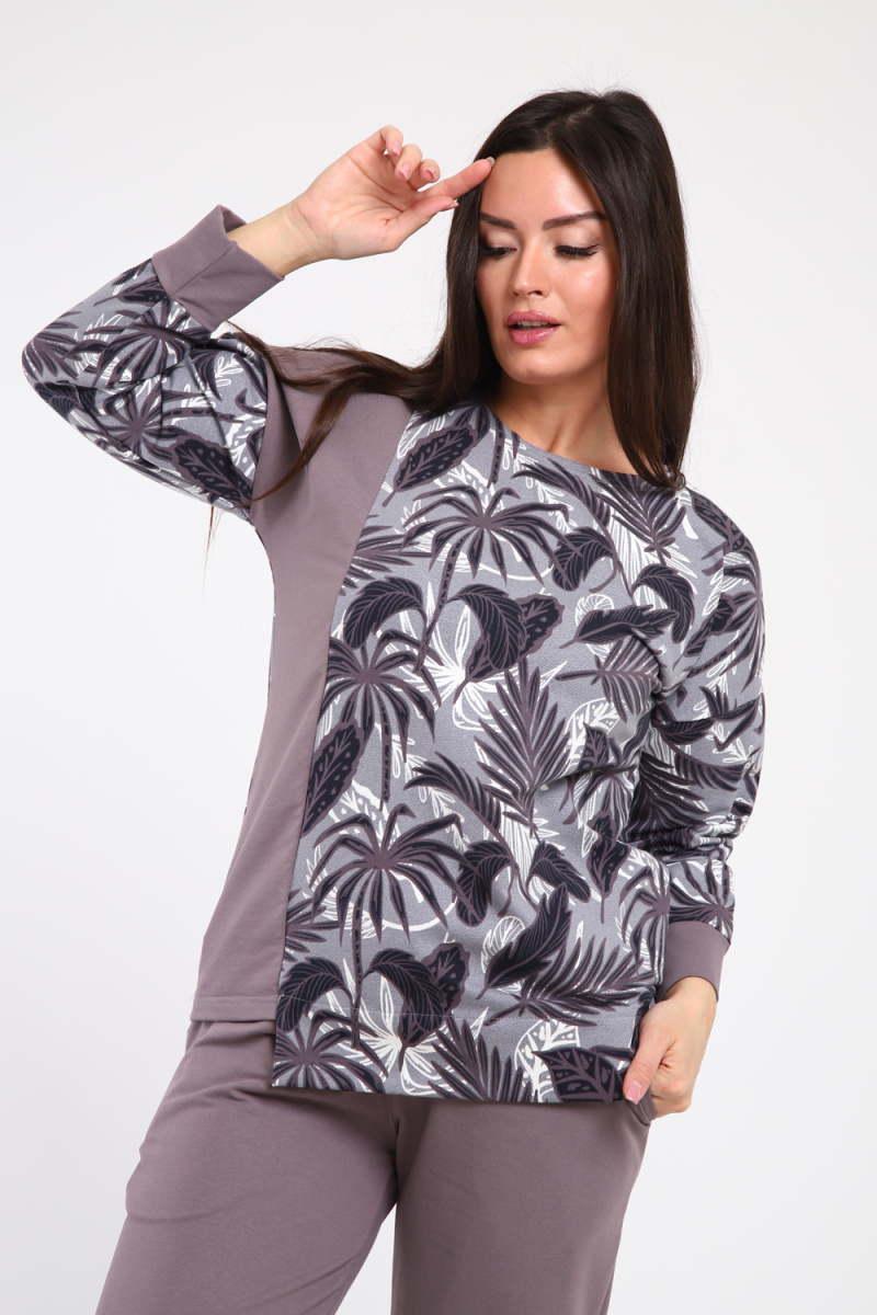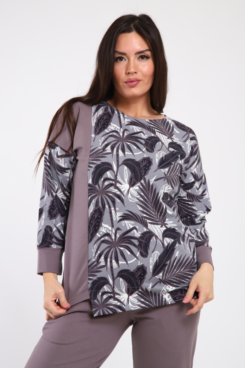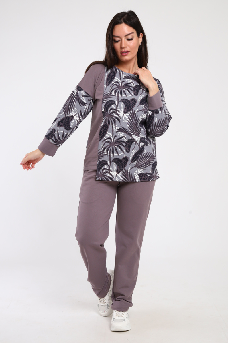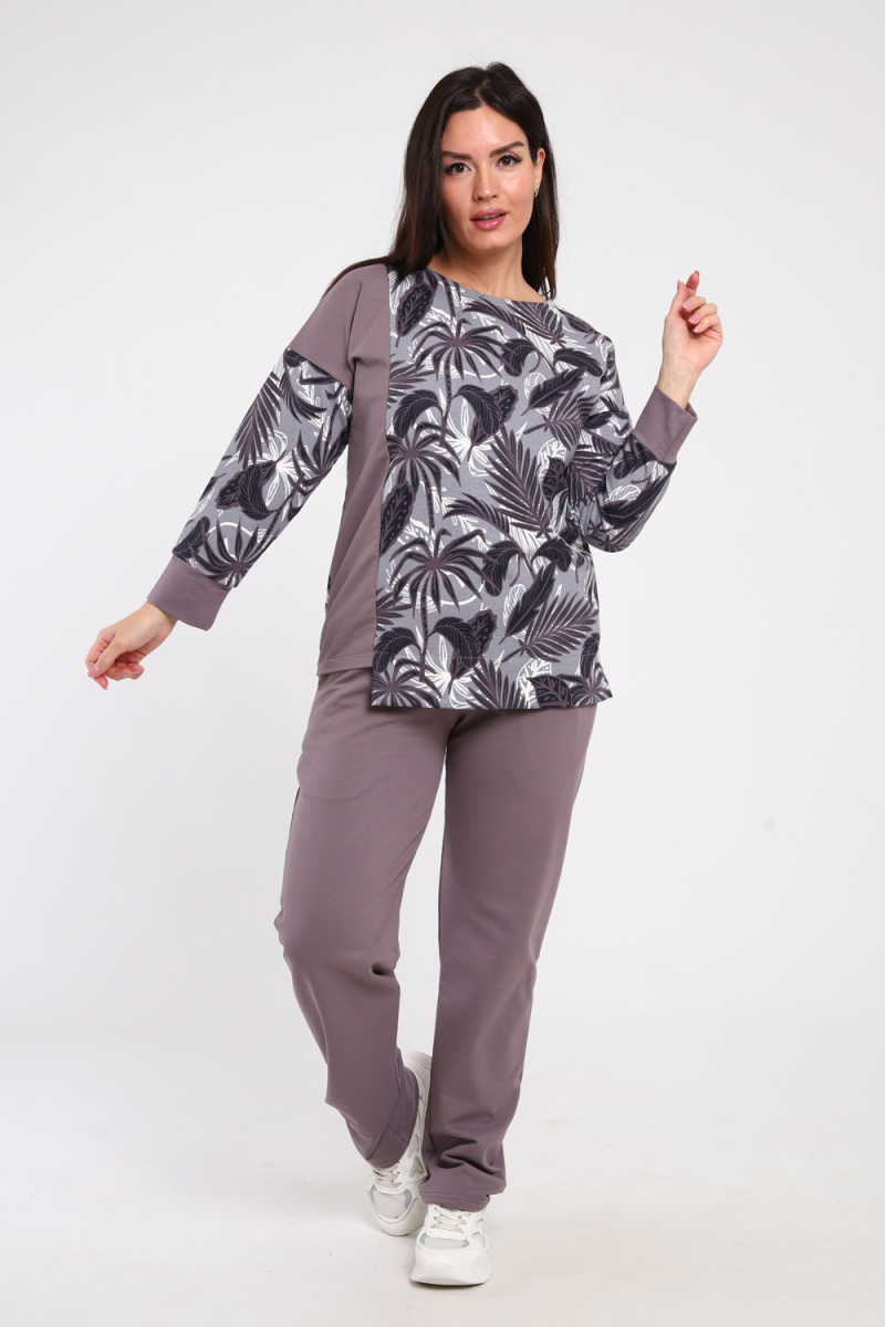Комбинированный костюм оригинально смотрится на любой фигуре, с легкостью совмещая в себе элегантность и комфорт. Джемпер со спущенным рукавом. Брюки прямого покроя с карманами, посадка средняя. Трикотажный женский костюм предназначен для девушек, ценящих комфорт, удобство. Подойдет для прогулок в кино с друзьями, путешествий, работы в офисе, праздника, а также как вечерний модный образ на свидание.