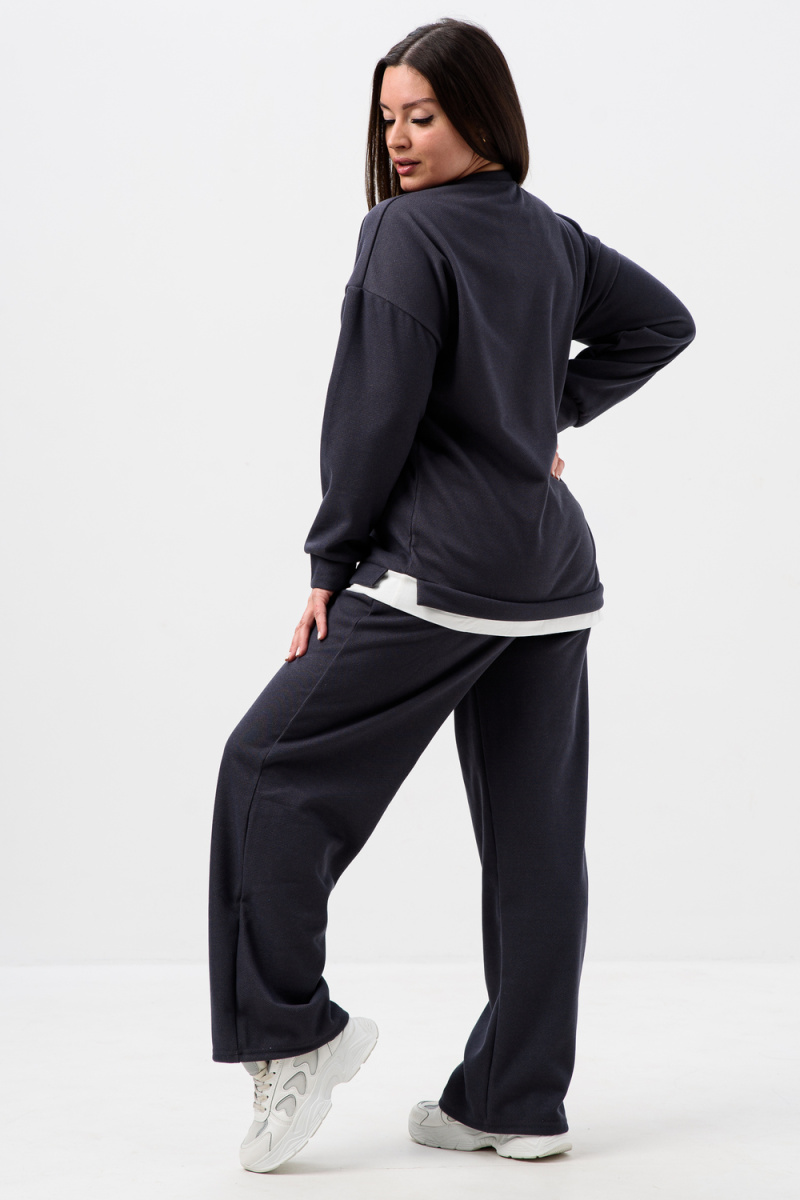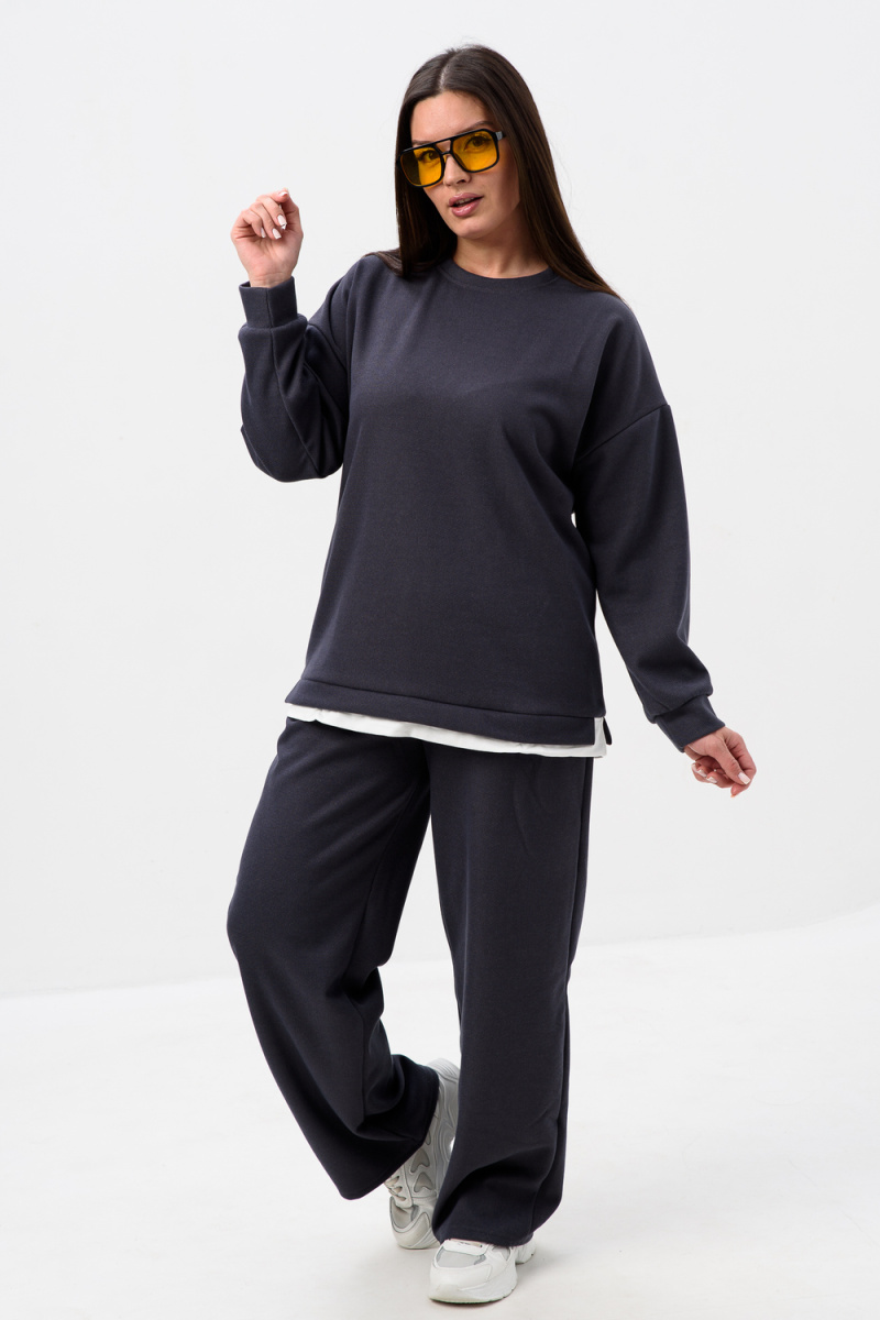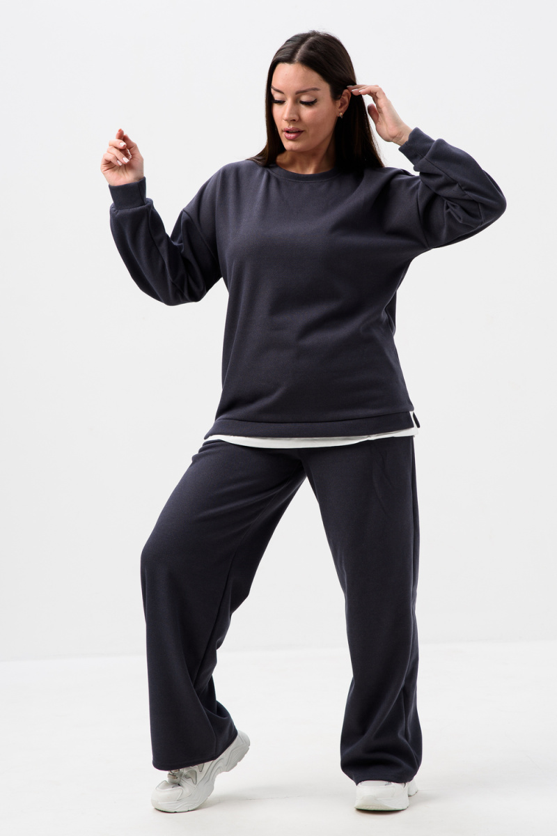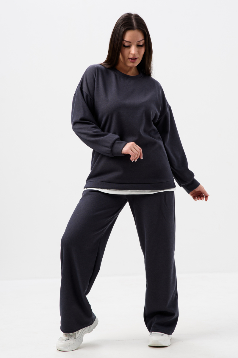 Женский костюм из мягкой, фактурной и приятной ткани. Вверх - худи оверсайз со спущенным рукавом и округлой горловиной, понизу обманка - иллюзия футболки, которая придает современный стиль двойке, низ - свободные и прямые брюки палаццо, по бокам карманы, пояс на резинке. Костюм идеально подходит для повседневной носки.