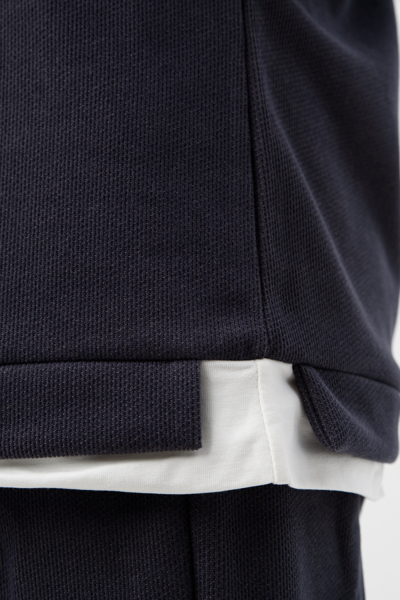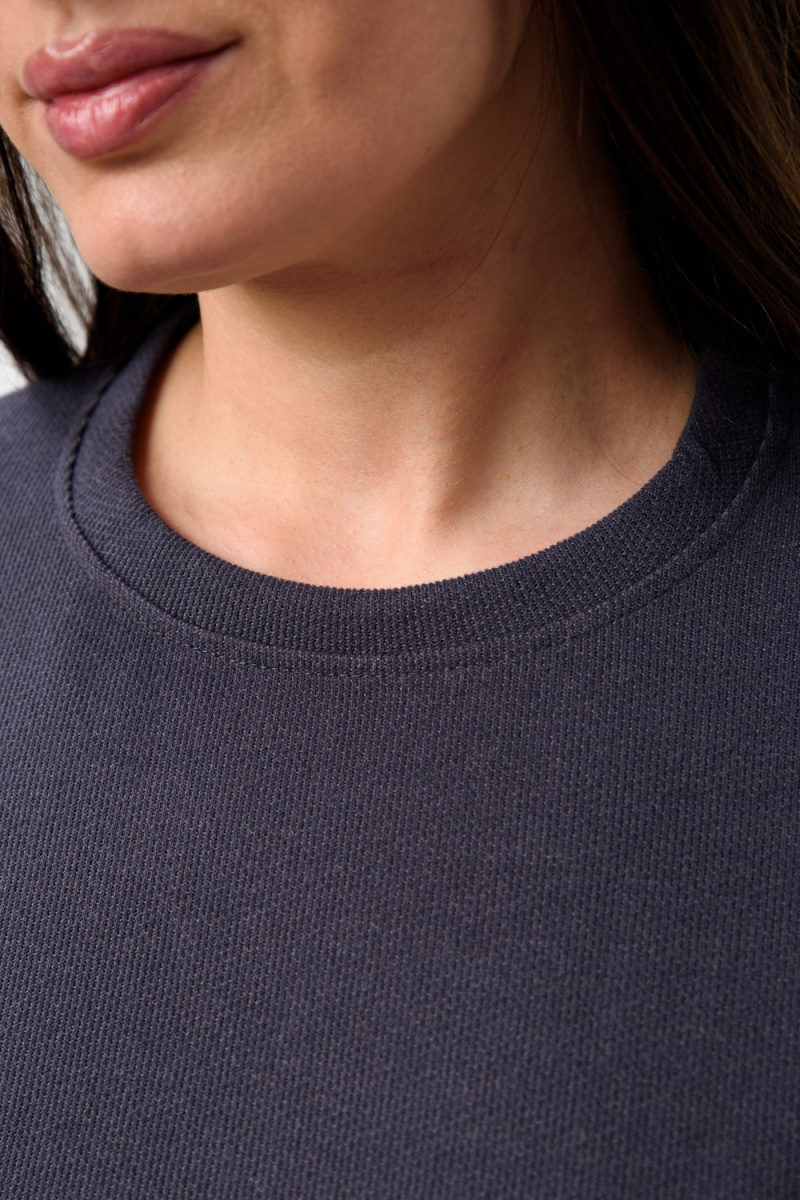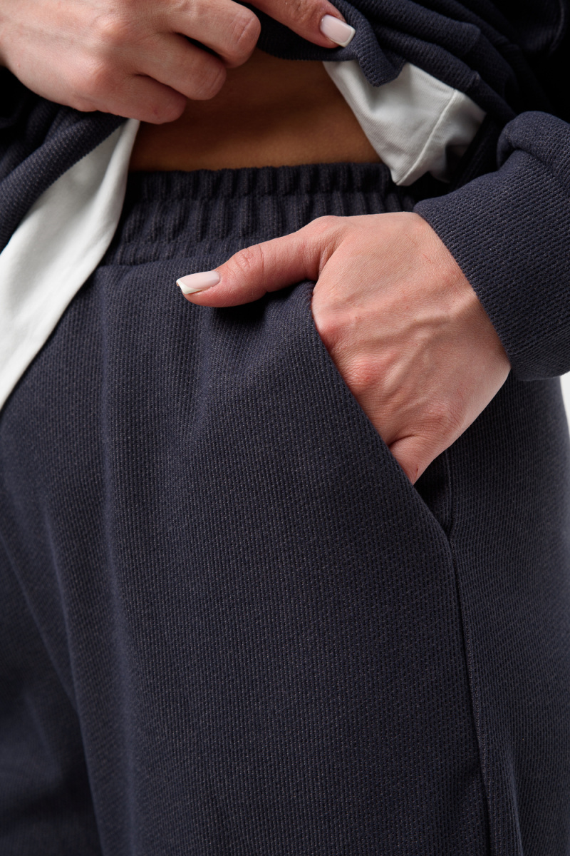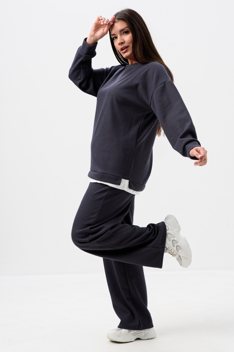 Женский костюм из мягкой, фактурной и приятной ткани. Вверх - худи оверсайз со спущенным рукавом и округлой горловиной, понизу обманка - иллюзия футболки, которая придает современный стиль двойке, низ - свободные и прямые брюки палаццо, по бокам карманы, пояс на резинке. Костюм идеально подходит для повседневной носки.