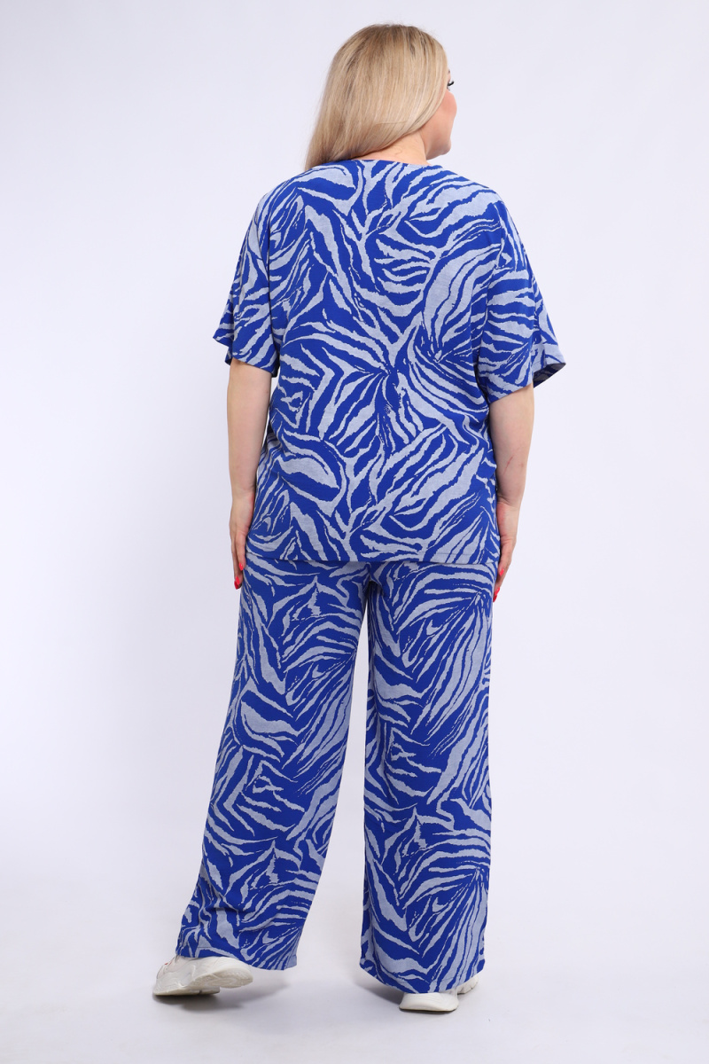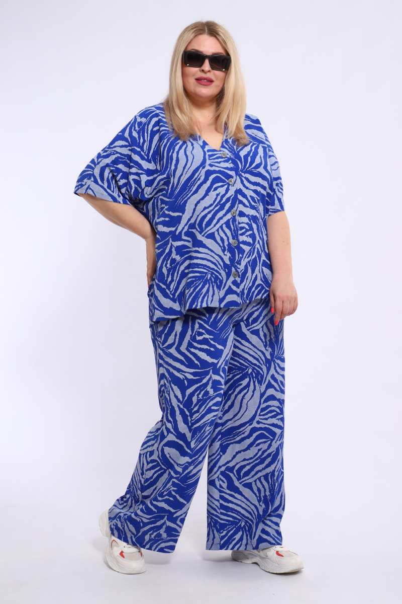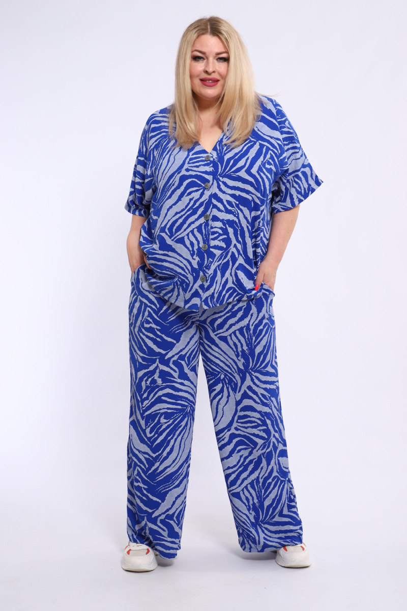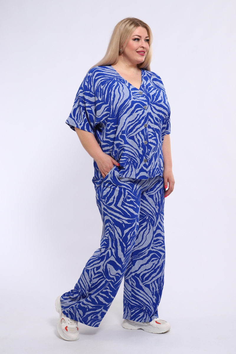 Представляем изысканный женский брючный костюм, сочетающий в себе современные тренды и безупречный комфорт. Этот комплект включает в себя стильную рубашку с V-образным вырезом на пуговицах и модные брюки палаццо.